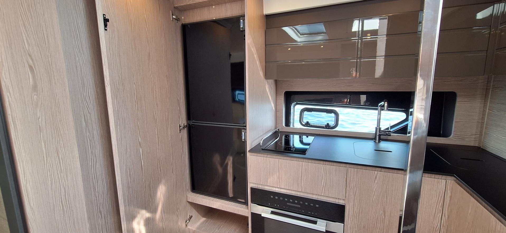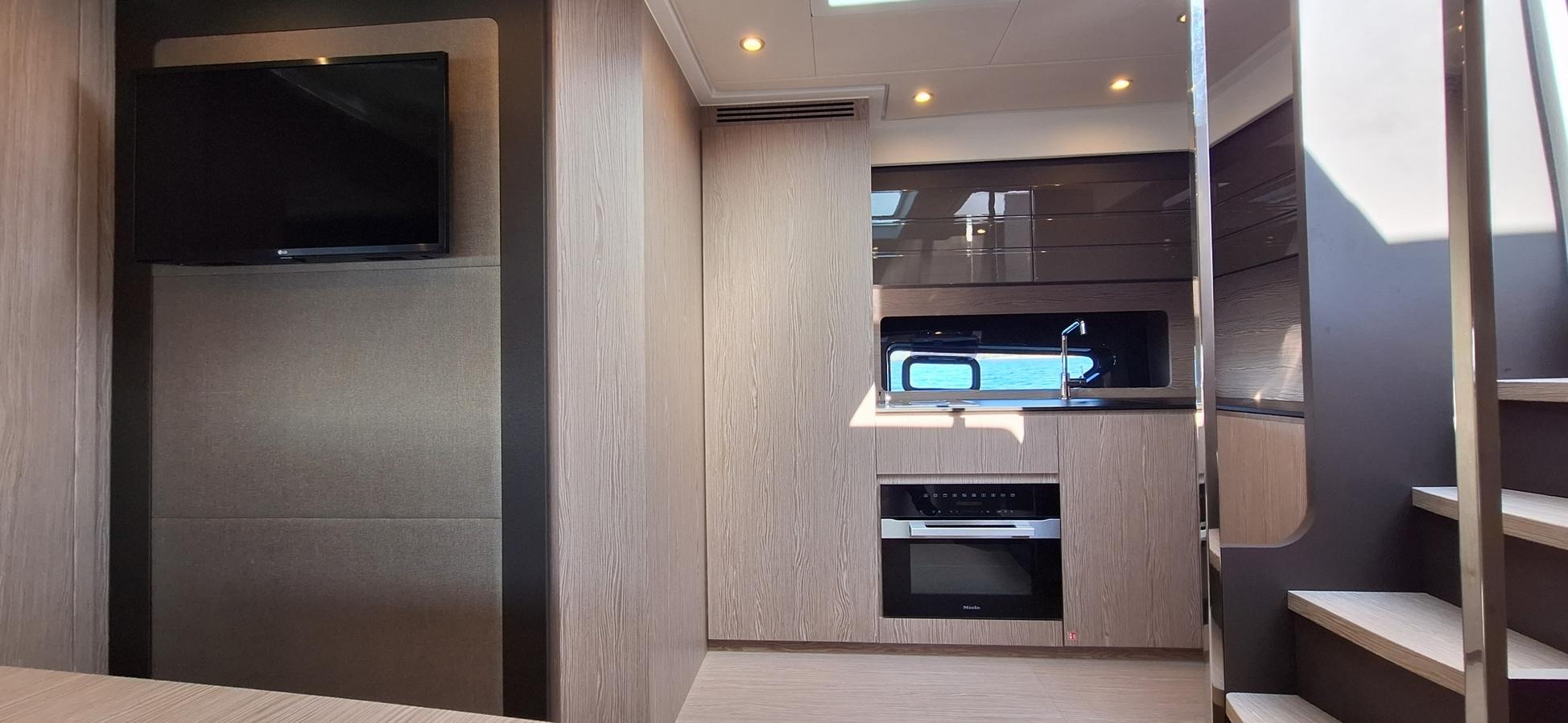 Benedendeks vinden we een volledig uitgeruste galley met enorm veel bergruimte, Miele inbouw combimagnetron, inductie kookplaat en zéér ruime koelkast met apart vriesvak. De salon biedt een comfortabele U vormige bank met eenvoudig handbediende hoog/laag salon tafel, waar eenvoudig een extra bed van gemaakt kan worden. Ook bevindt zich het dagtoilet met aparte doucheruimte zich daar, wat tevens toebehoort aan de onverwacht ruime guestcabin. Deze cabin heeft twee losse bedden die simpel tot één groot bed om te toveren zijn, en daar naast nóg een enkel bed waardoor het totaal aantal slaapplaatsen in deze Atlantis 45 op maar liefst 7 komt.