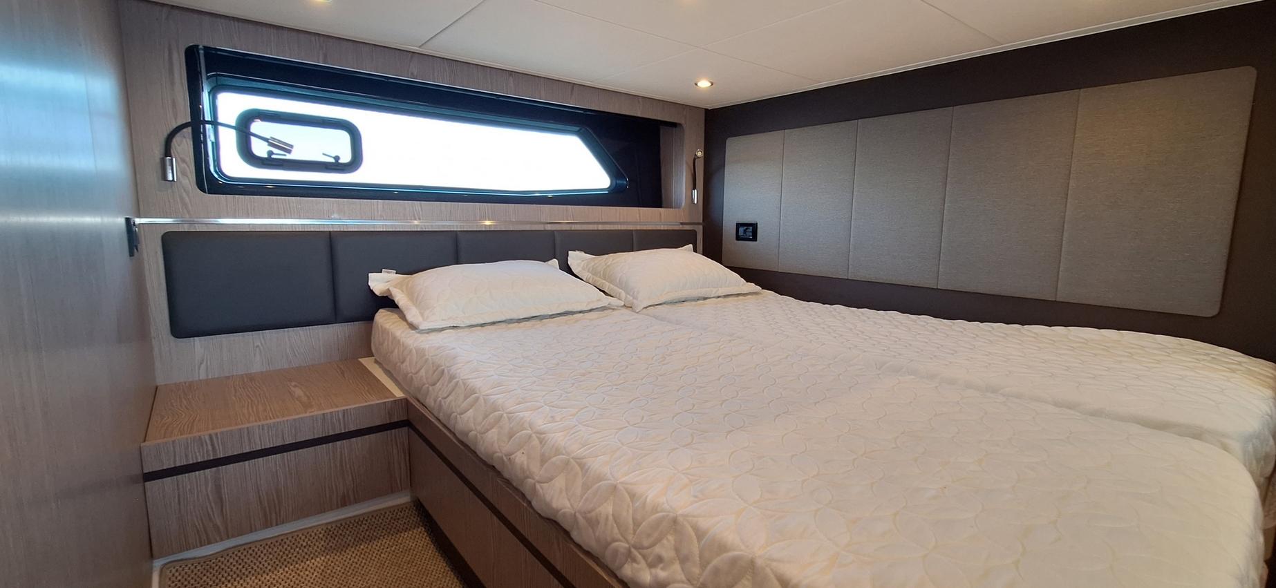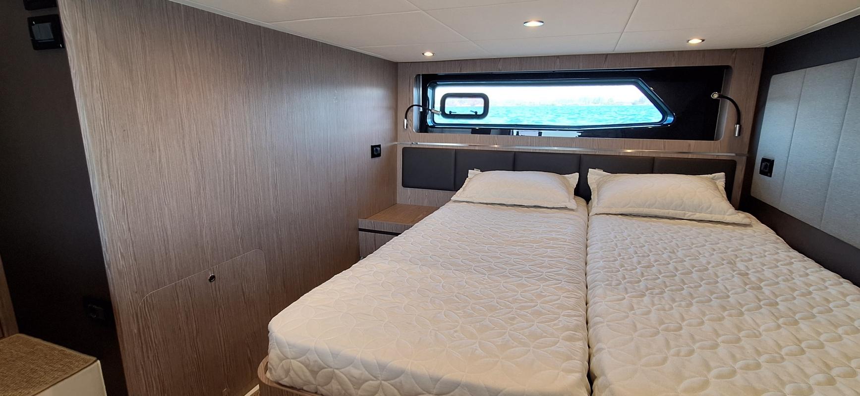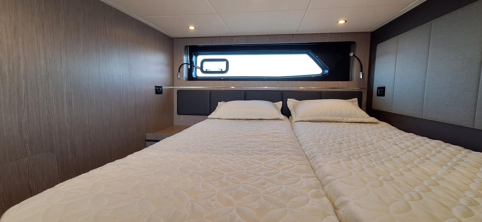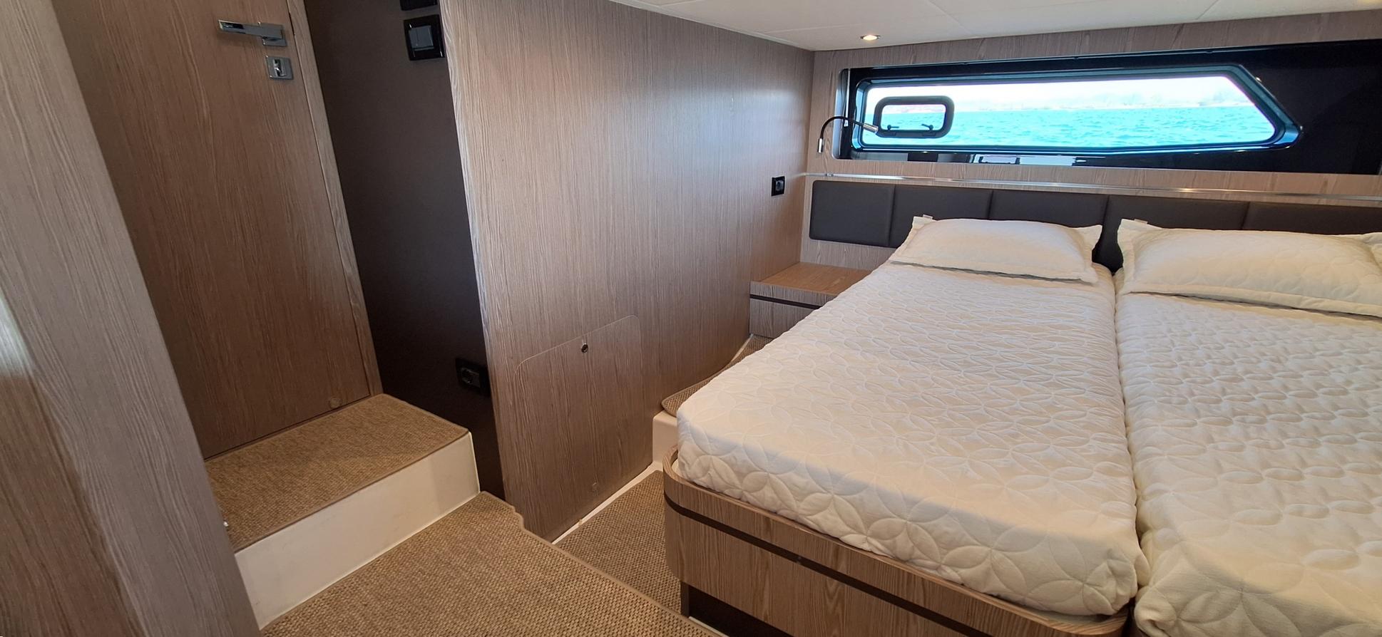 De ownerscabin vinden we in de boeg en is een fijne en lichte ruimte, vanzelfsprekend ook voorzien van haar eigen ensuite badkamer. Alle ruimtes profiteren van een krachtig airconditioningsysteem, inclusief de cockpit. Het stijlvolle interieur, met een smaakvolle kleurstelling is nauwelijks gebruikt.