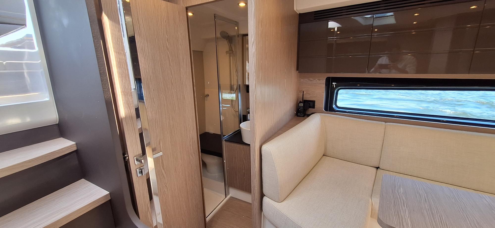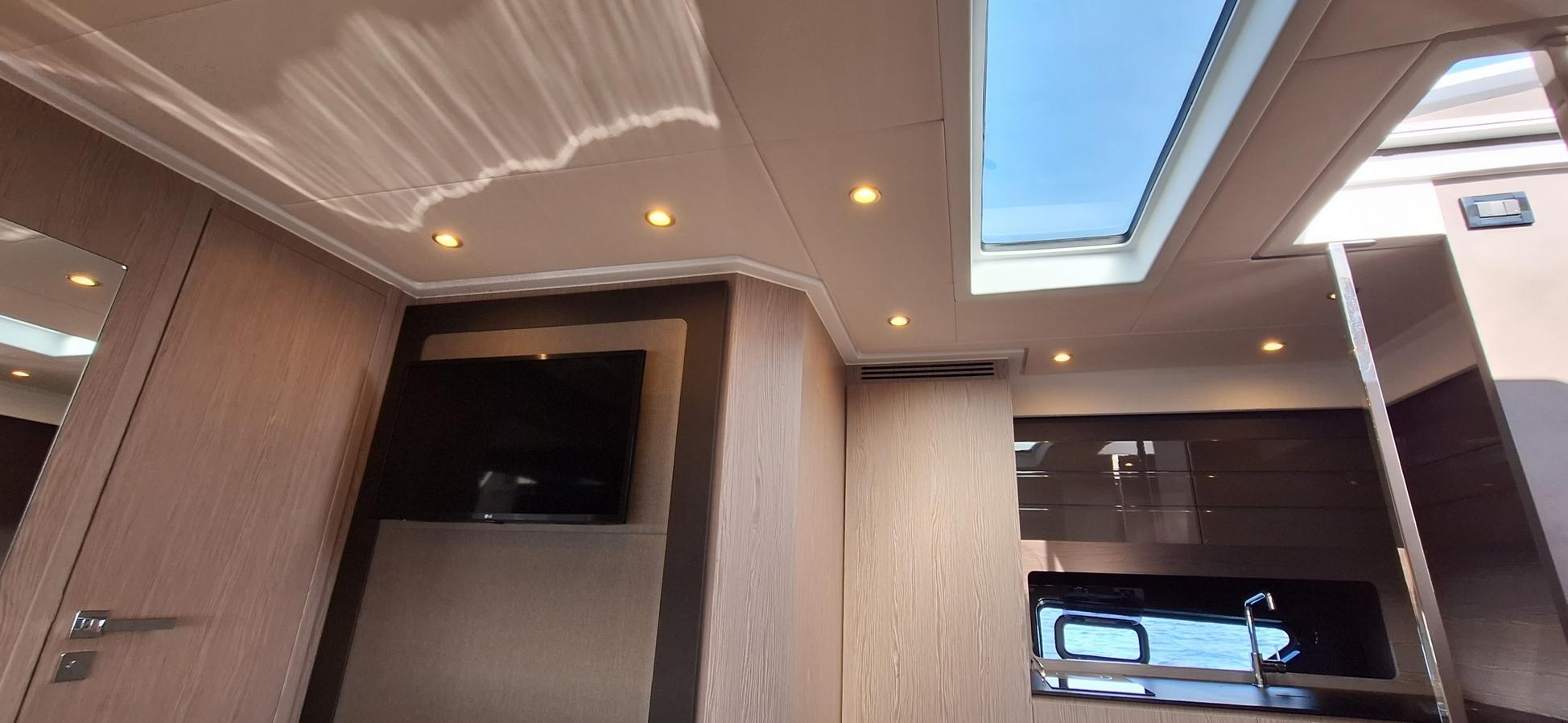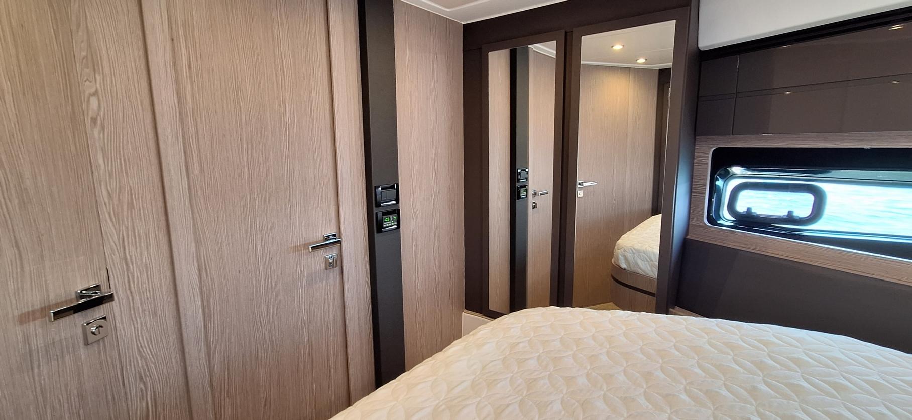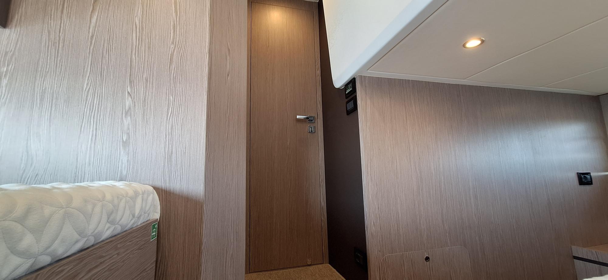 De ownerscabin vinden we in de boeg en is een fijne en lichte ruimte, vanzelfsprekend ook voorzien van haar eigen ensuite badkamer. Alle ruimtes profiteren van een krachtig airconditioningsysteem, inclusief de cockpit. Het stijlvolle interieur, met een smaakvolle kleurstelling is nauwelijks gebruikt.