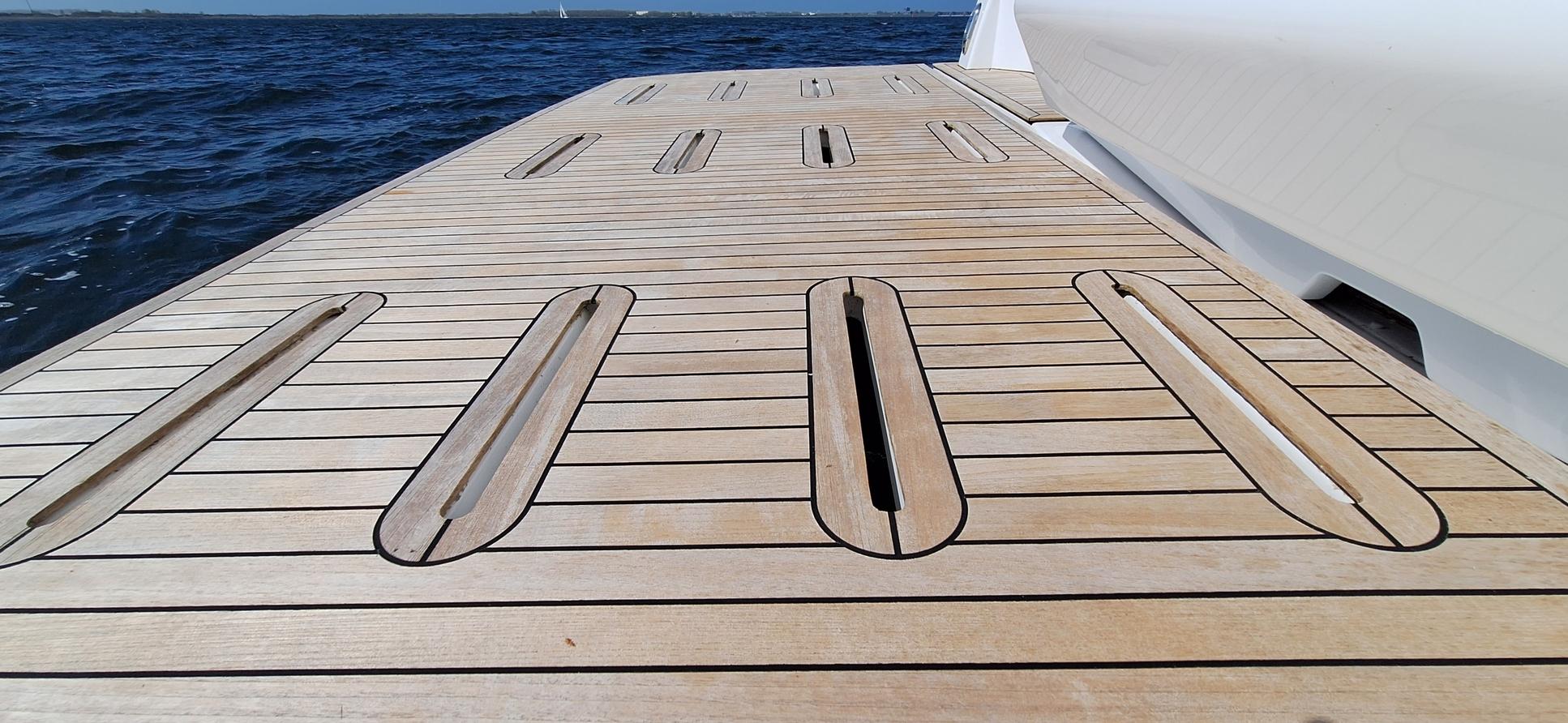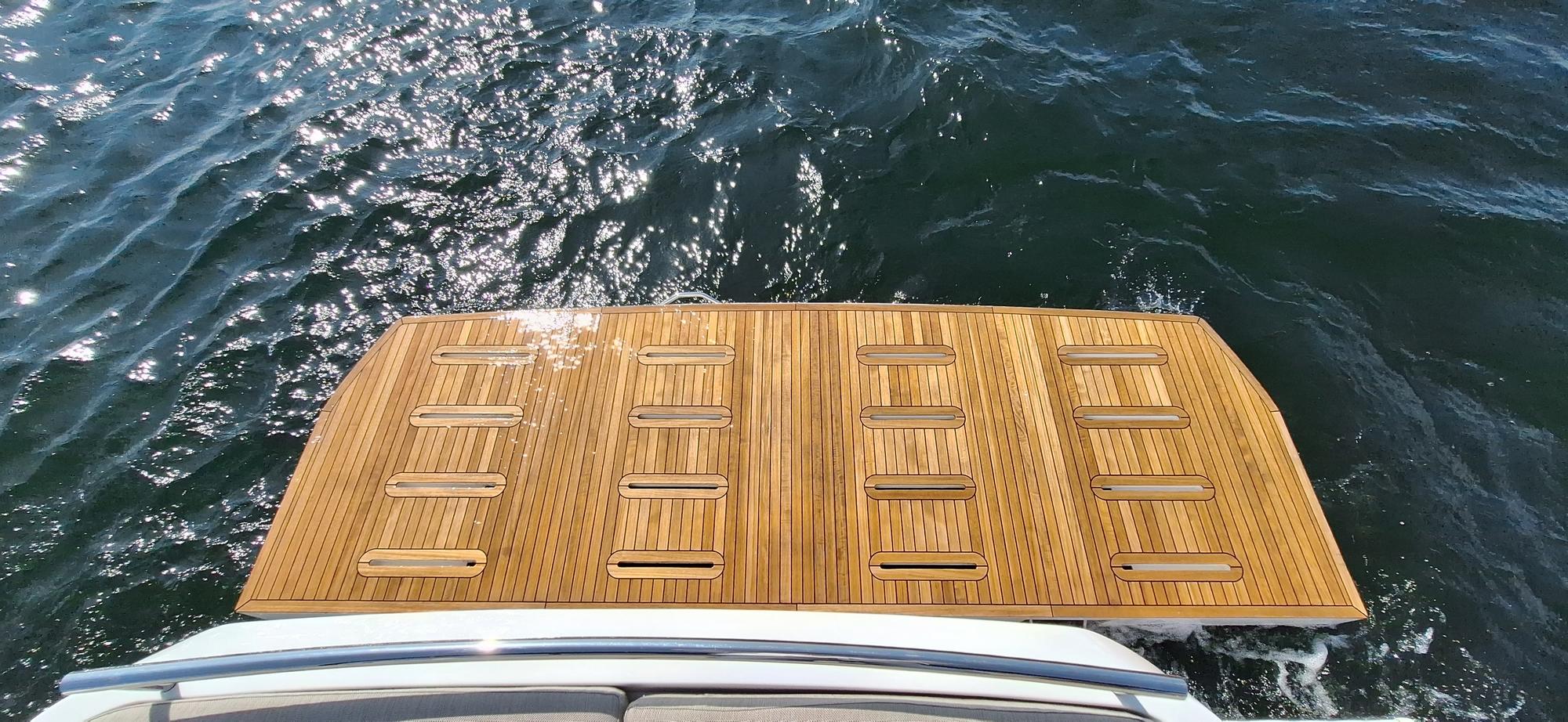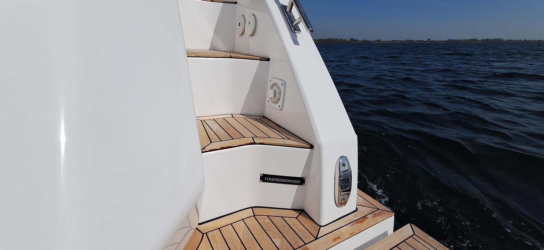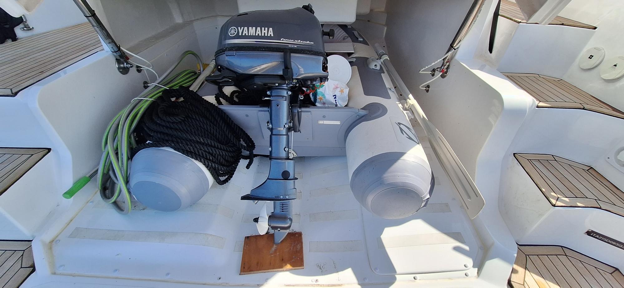 De Azimut Atlantis 45 is uitgerust met een hydraulisch zwemplatform en een garage met een hydraulisch te openen deur voor de bijboot, een Zodiac 230 AeroDeck met Yamaha F6CMHS buitenboordmotor.