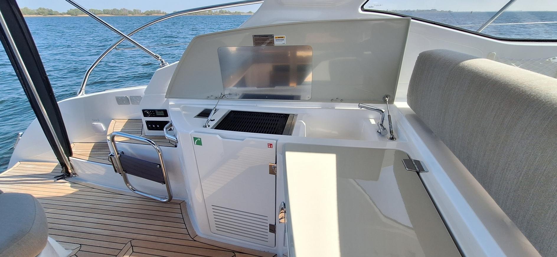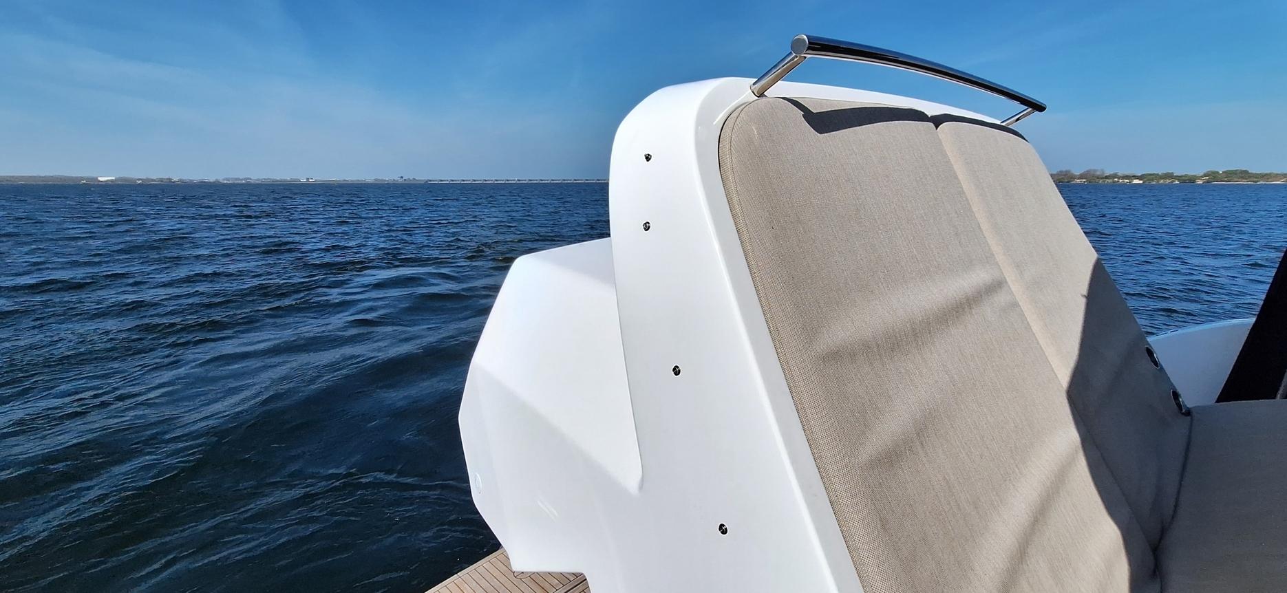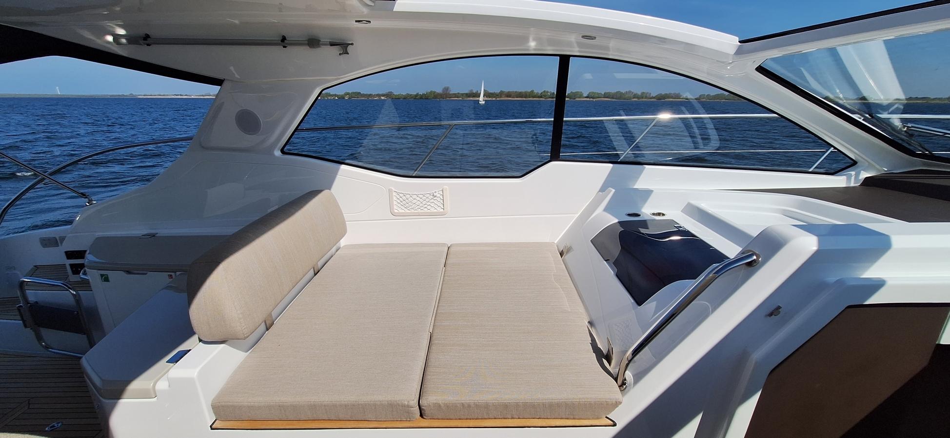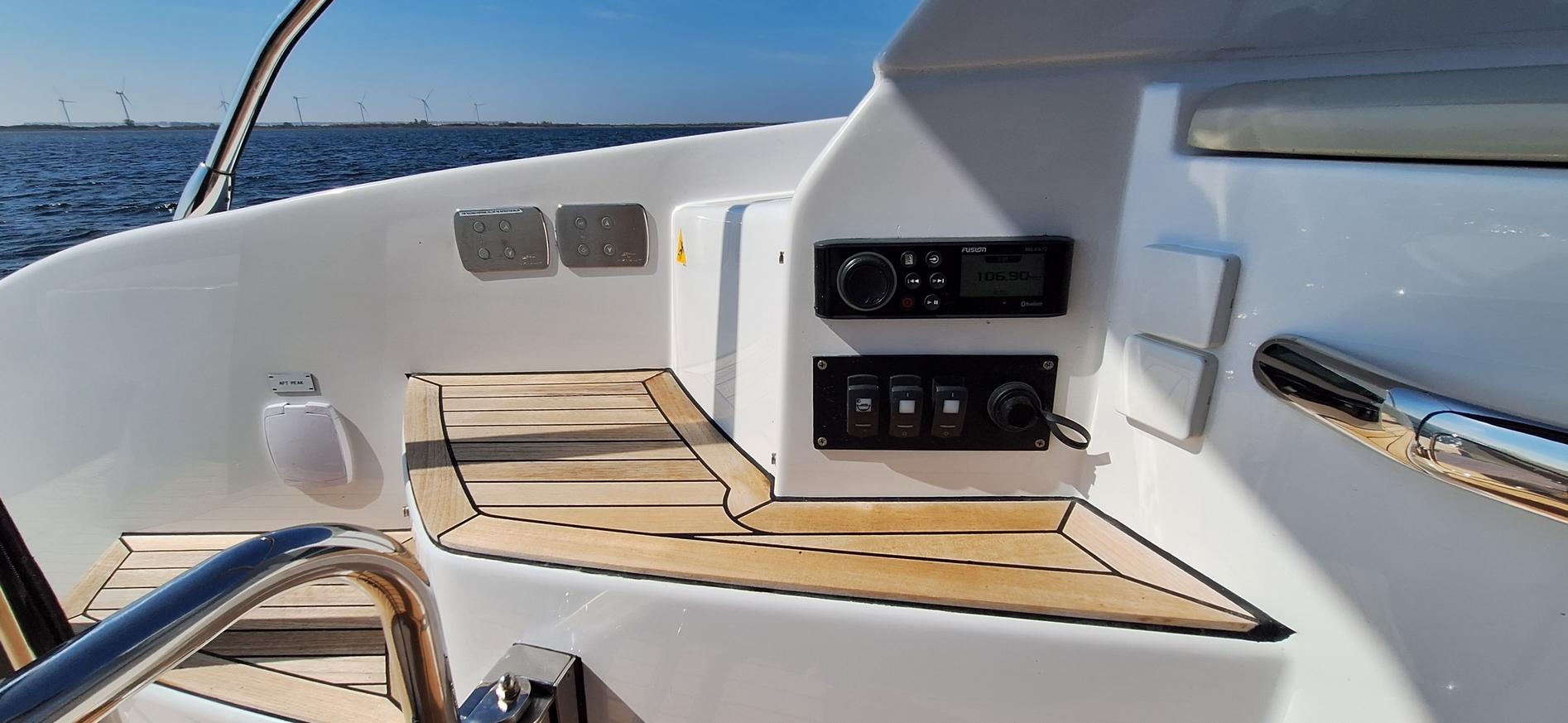 De Atlantis 45 is maar liefst 4,25m breed en dat merk je meteen. Via het hydraulische zwemplatform bereiken we de cockpit met bovenop de garage een groot zonnebed, de Fusion stereo installatie, een wetbar met electrische grilplaat en koelkast, een tweede zonnebed aan bakboord wat transformeert tot een comfortabele zit tijdens de langere reizen en een rijk uitgerust dashboard met een Garmin Platinum navigatiepakket.