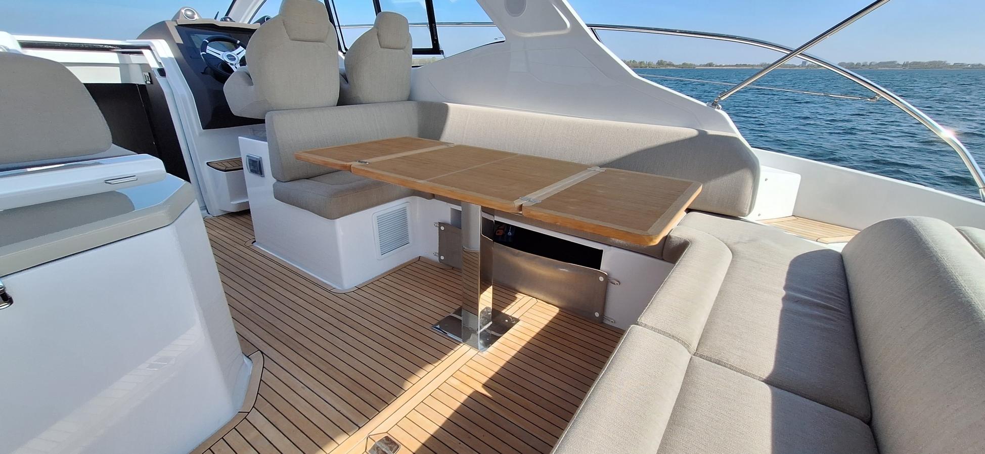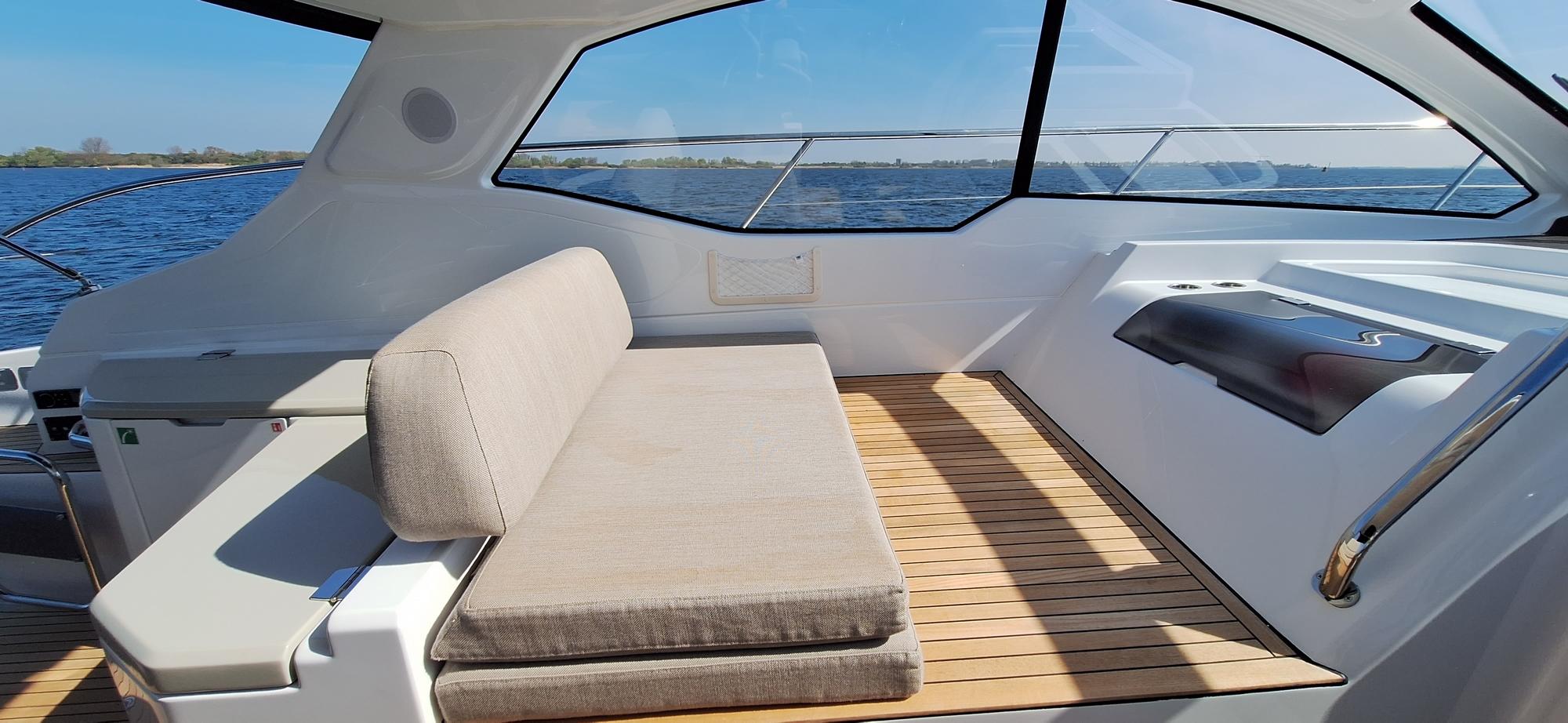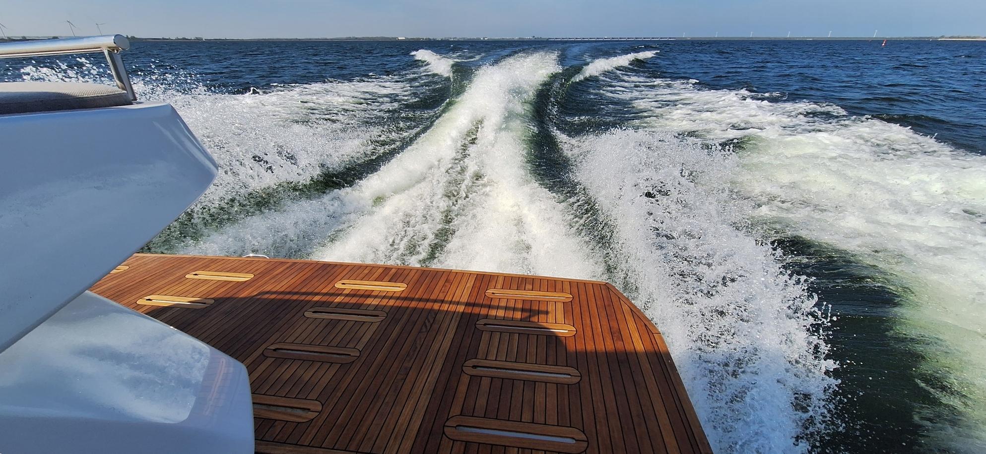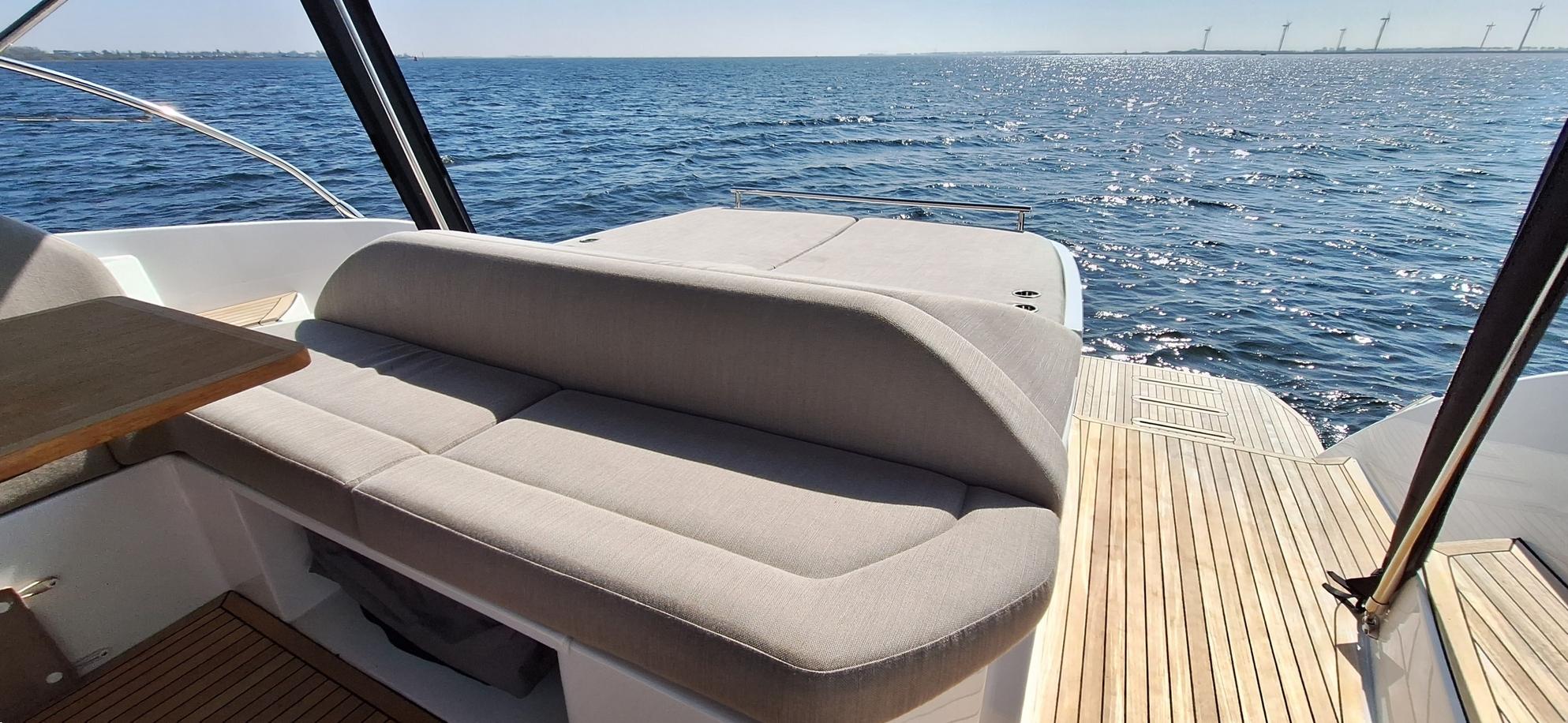 De Atlantis 45 is maar liefst 4,25m breed en dat merk je meteen. Via het hydraulische zwemplatform bereiken we de cockpit met bovenop de garage een groot zonnebed, de Fusion stereo installatie, een wetbar met electrische grilplaat en koelkast, een tweede zonnebed aan bakboord wat transformeert tot een comfortabele zit tijdens de langere reizen en een rijk uitgerust dashboard met een Garmin Platinum navigatiepakket.