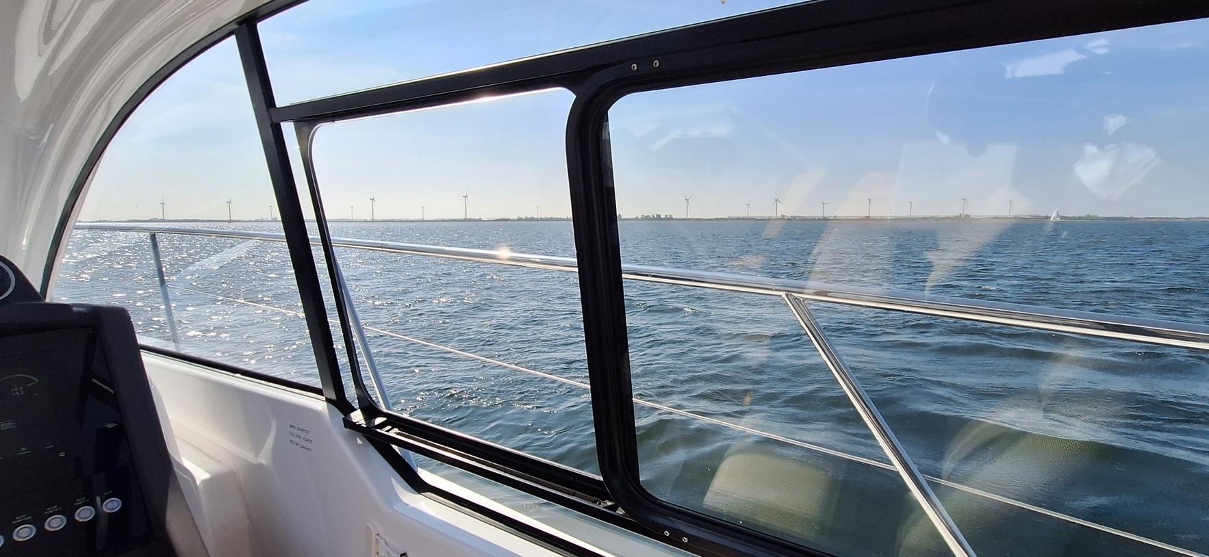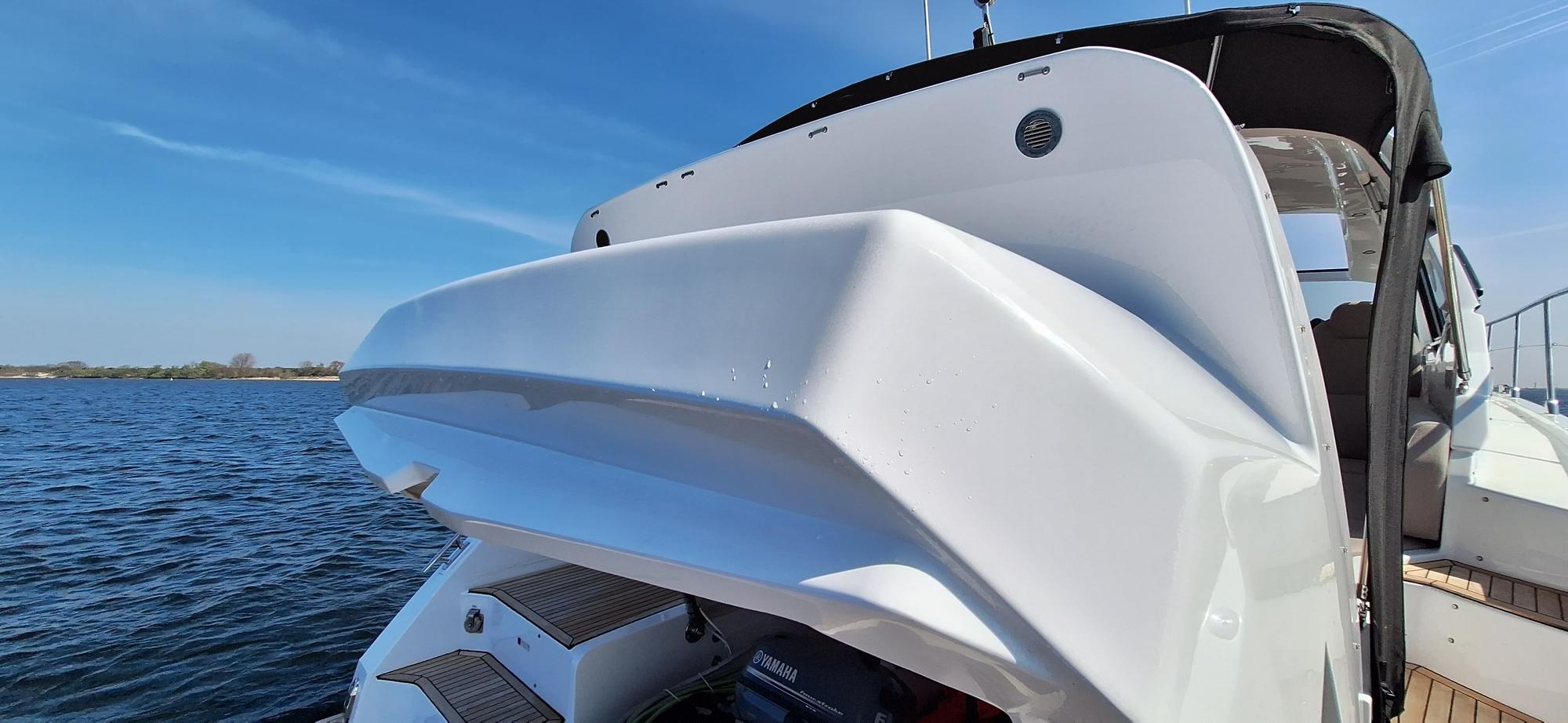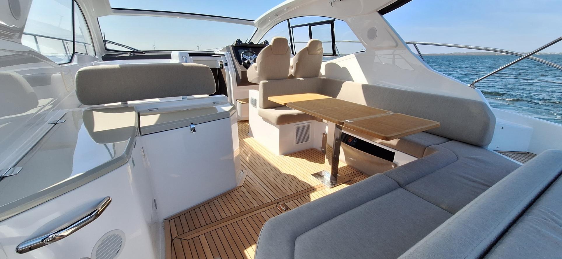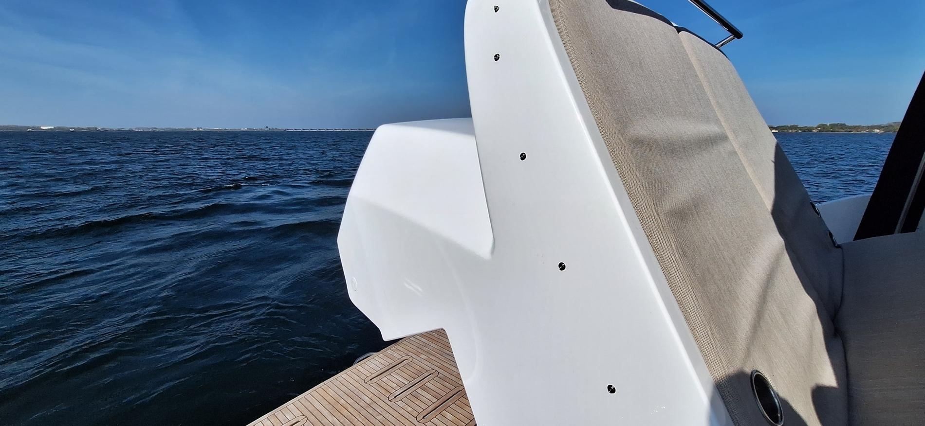 De Atlantis 45 is maar liefst 4,25m breed en dat merk je meteen. Via het hydraulische zwemplatform bereiken we de cockpit met bovenop de garage een groot zonnebed, de Fusion stereo installatie, een wetbar met electrische grilplaat en koelkast, een tweede zonnebed aan bakboord wat transformeert tot een comfortabele zit tijdens de langere reizen en een rijk uitgerust dashboard met een Garmin Platinum navigatiepakket.