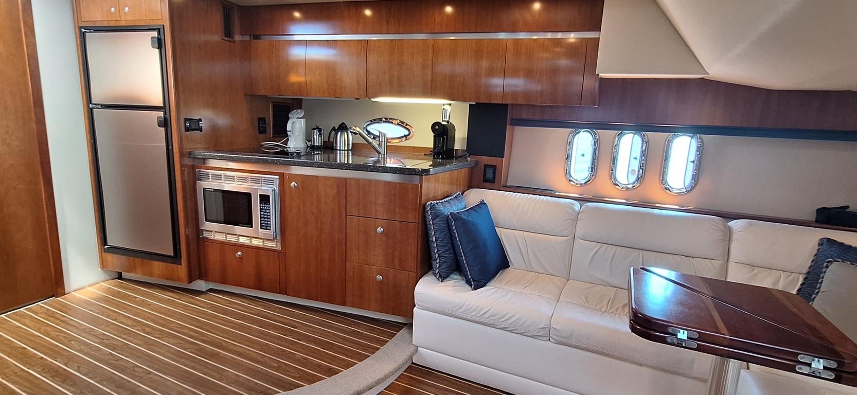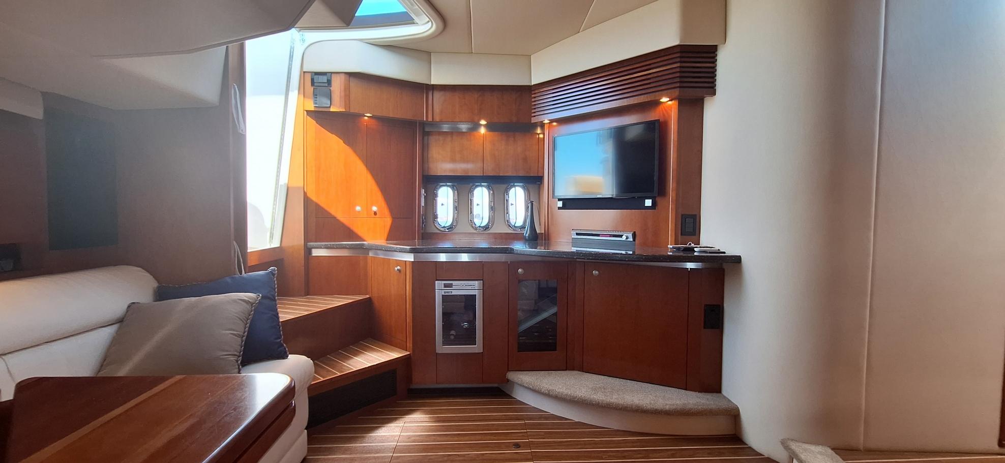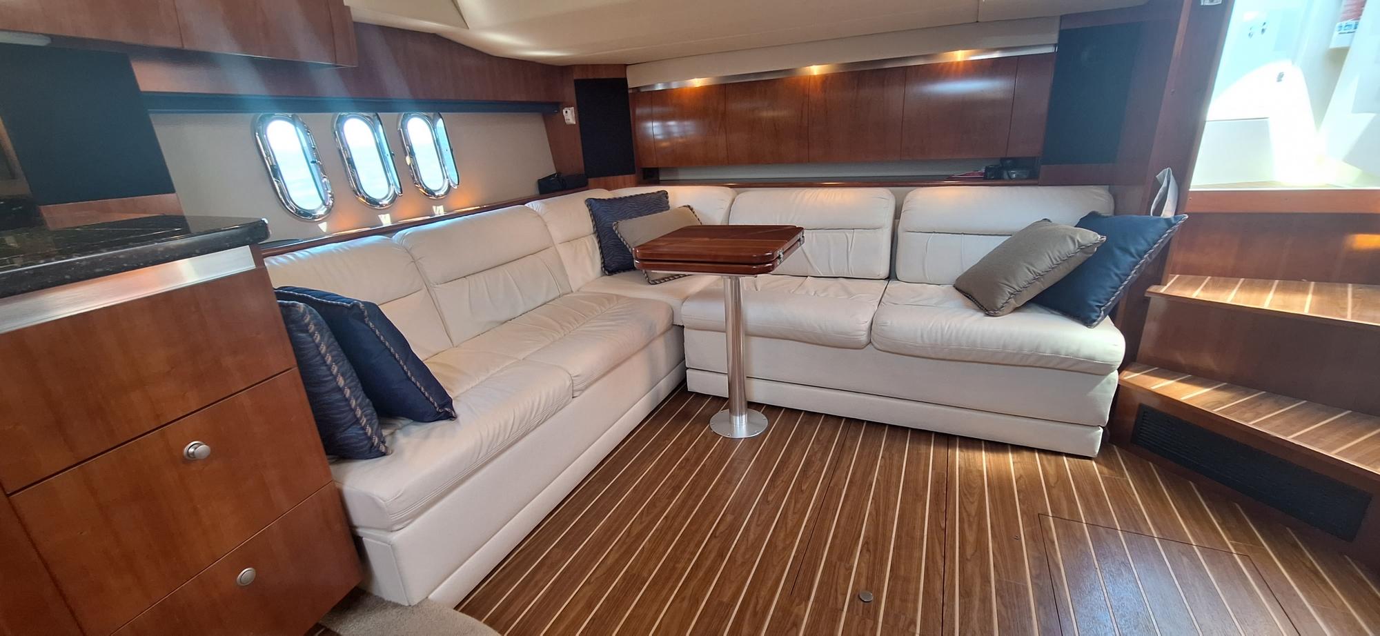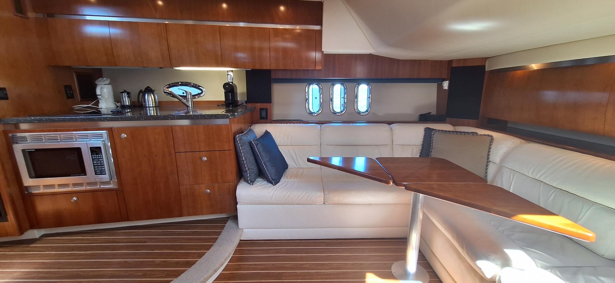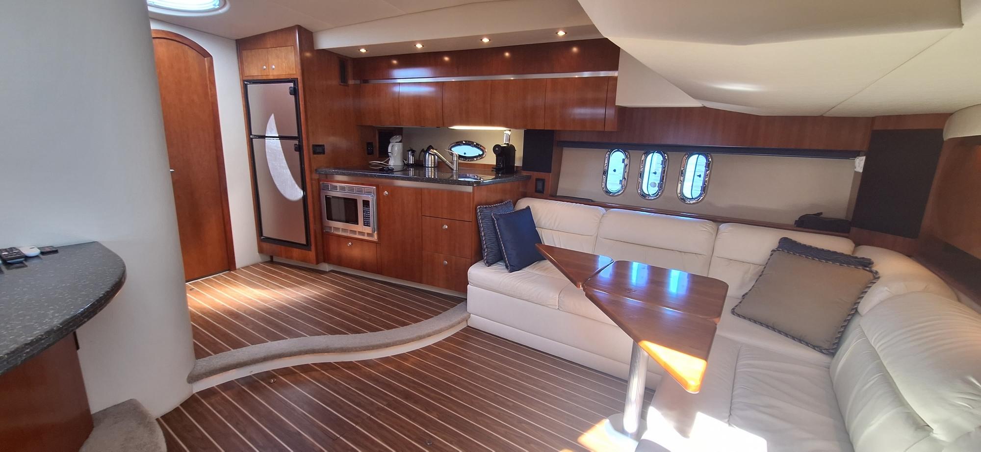 De cockpit heeft meerdere niveaus en een gezellige lay-out die simpel anders geconfigureerd kan worden. De cabine voelt meer als een thuis aan dan als een jacht! De galley is zeer ruim en bijzonder goed toegerust met apparatuur, waardoor het bereiden van eten zeer eenvoudig wordt. De dinette is heerlijk om aan te eten of te loungen met een wijnkoeler in de buurt waar iedere dorstige watersporter dol op zal zijn. Voorts heeft ze een ruime sofabank die in een handomdraai te veranderen is in een slaapbank, een zeer ruime badkamer en vóór in het jacht een ruime cabin met tweepersoonsbed. In de cockpit, de salon en de hut is de stahoogte bijzonder goed, iets wat vooral lange mensen zeer zal aanspreken.