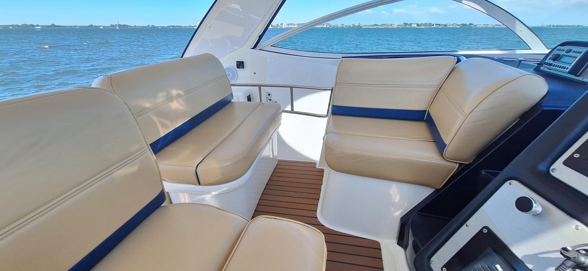 Zandkleurige bekleding met donker blauwe piping in de cockpit