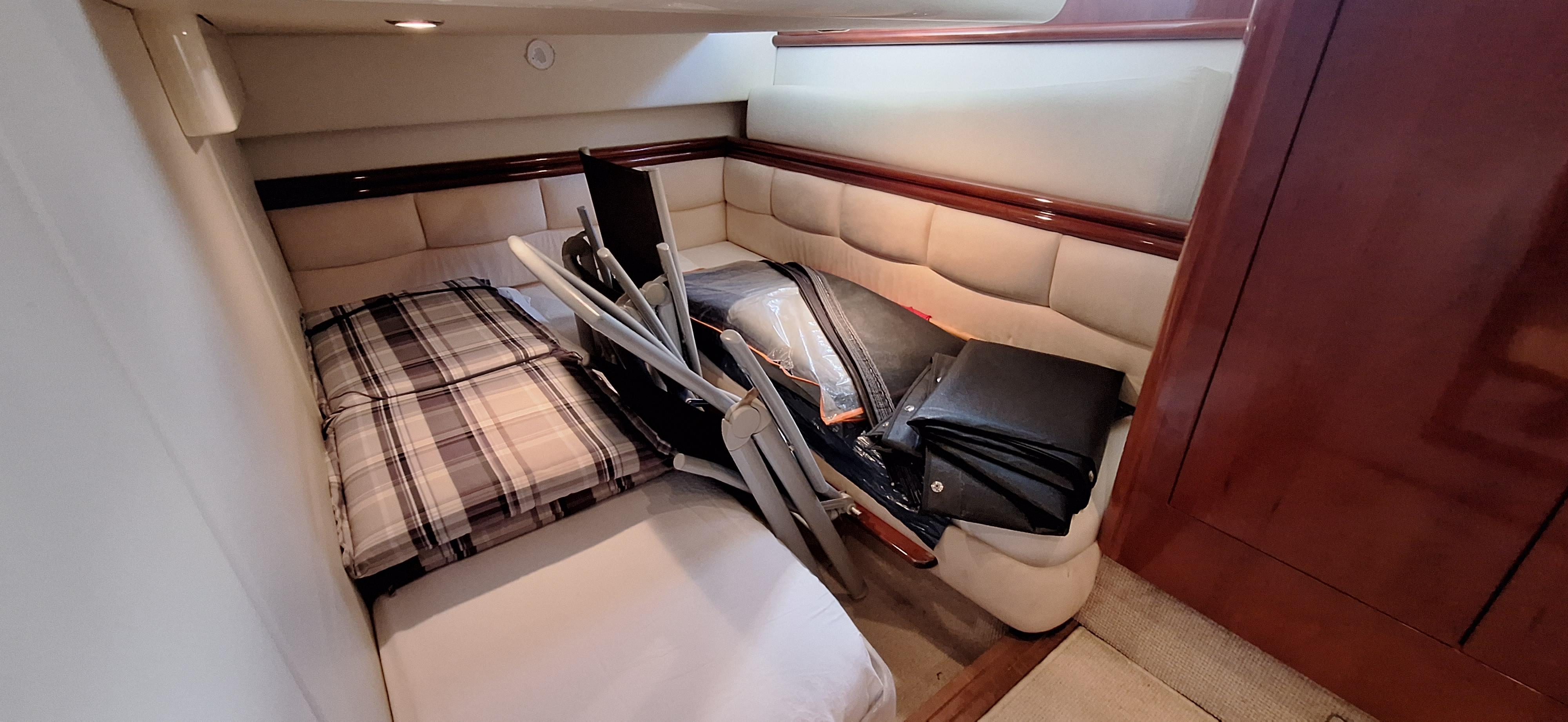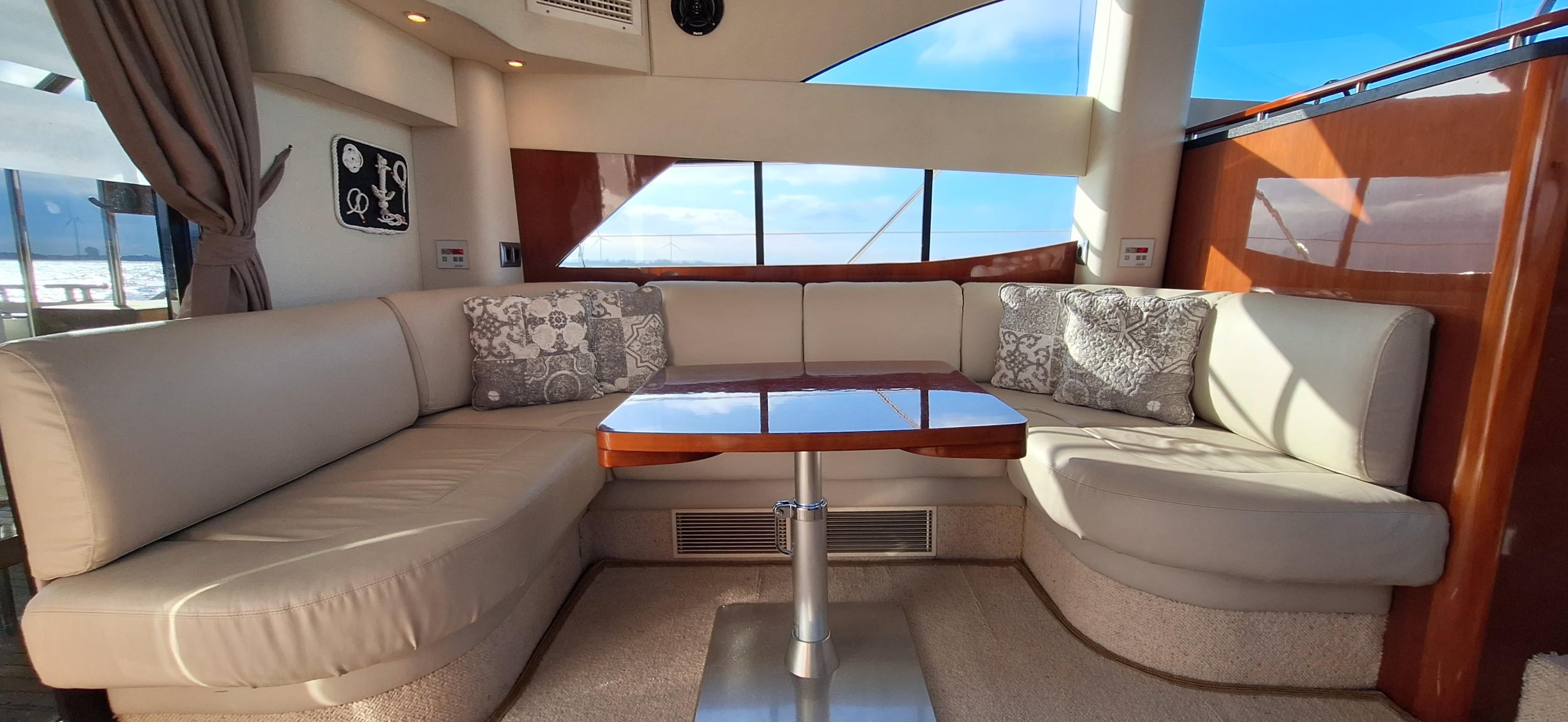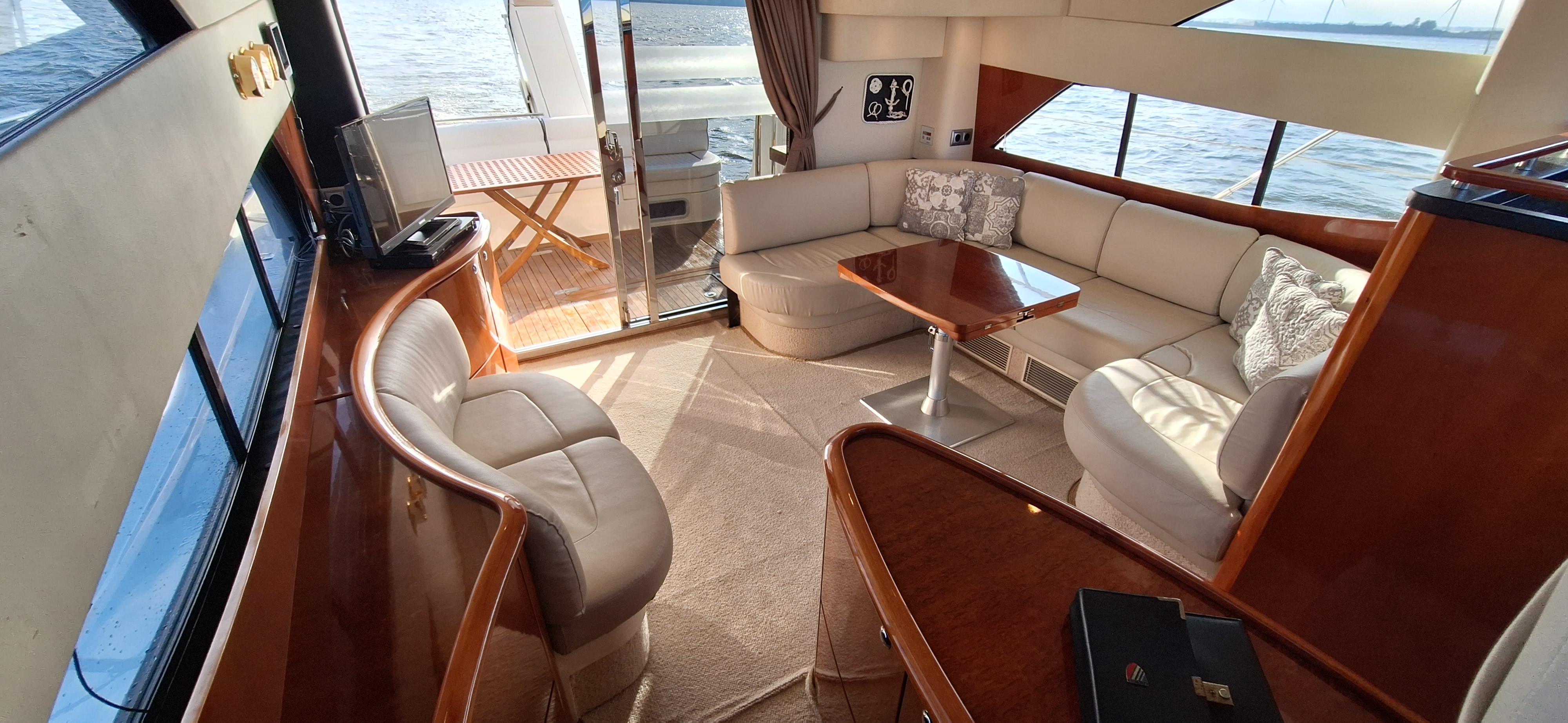 Deze keurig onderhouden Fairline Phantom 50 Mk1 is gebouwd bij Fairline Boats in 2002 en is uitgerust de oorspronkelijke layout, dus met de ruime zitbank aan bakboord zijde en de ruime galley die van alle gemakken voorzien is, zoals een inductie kookplaat, combimagnetron, grote koelkast en veel opbergruimte. Benedendeks vinden we drie hutten en twee ruime en lichte badkamers. Achterin het jacht bevindt zich de crewcabin wat als bergruimte gebruikt kan worden.