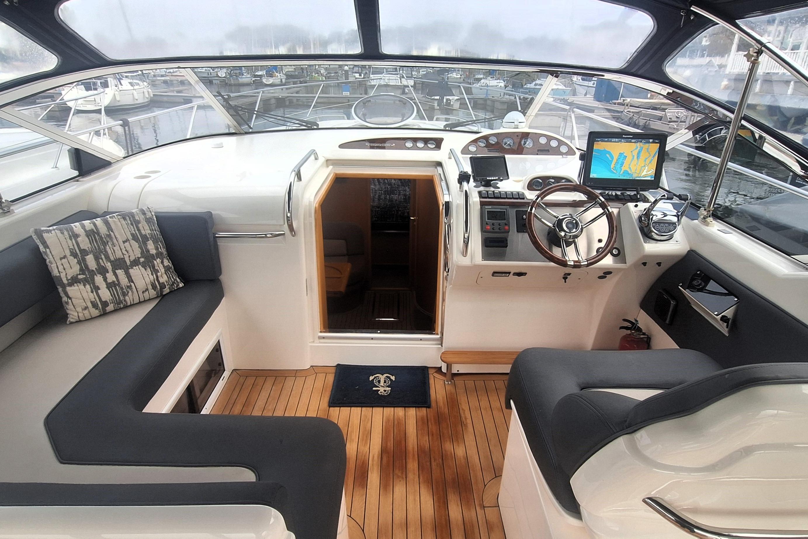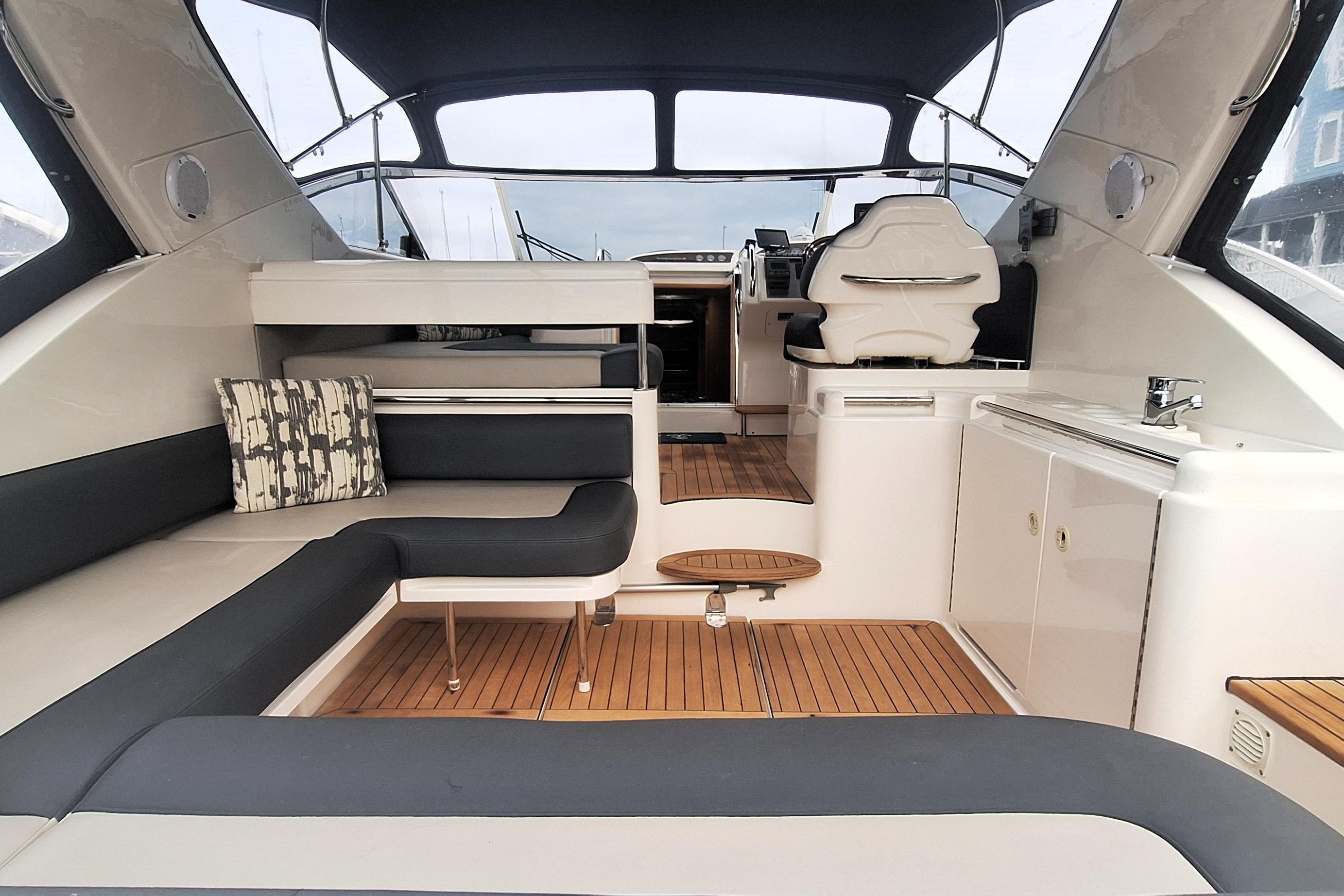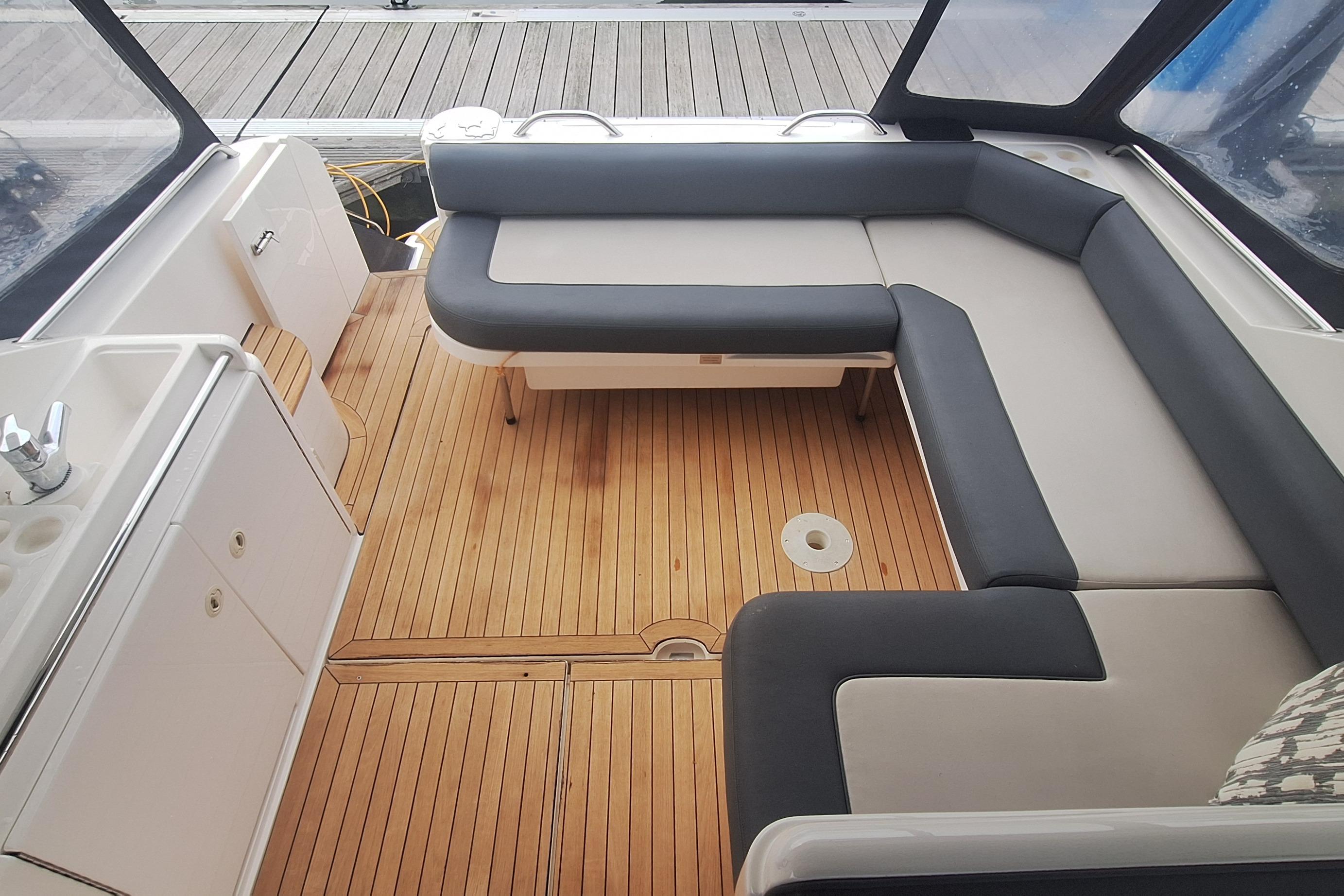 Opvallend aan de Targa 39 is het comfort aan boord. Vanuit het met Flexiteak gelegde zwemplatform stappen we de ruime cockpit binnen, met aan bakboordzijde een rechthoekige bank en tegenover een wetbar, voorzien van een wasbakje, bergruimte en een extra koelkast. Een trede hoger is eveneens aan bakboord zijde een L vormige zit, ideaal om actief mee te varen. Het dashboard is uitgerust met alles wat u nodig heeft, zoals een Raymarine autopilot, moderne Raymarine kaartplotter met radar, AIS en marifoon. Er is een hele zware Duco boegschroef geplaatst om het manoeuvreren eenvoudig te maken.
