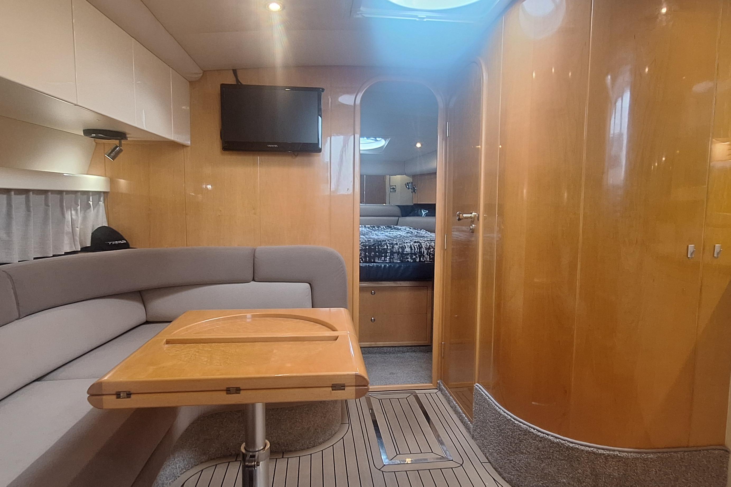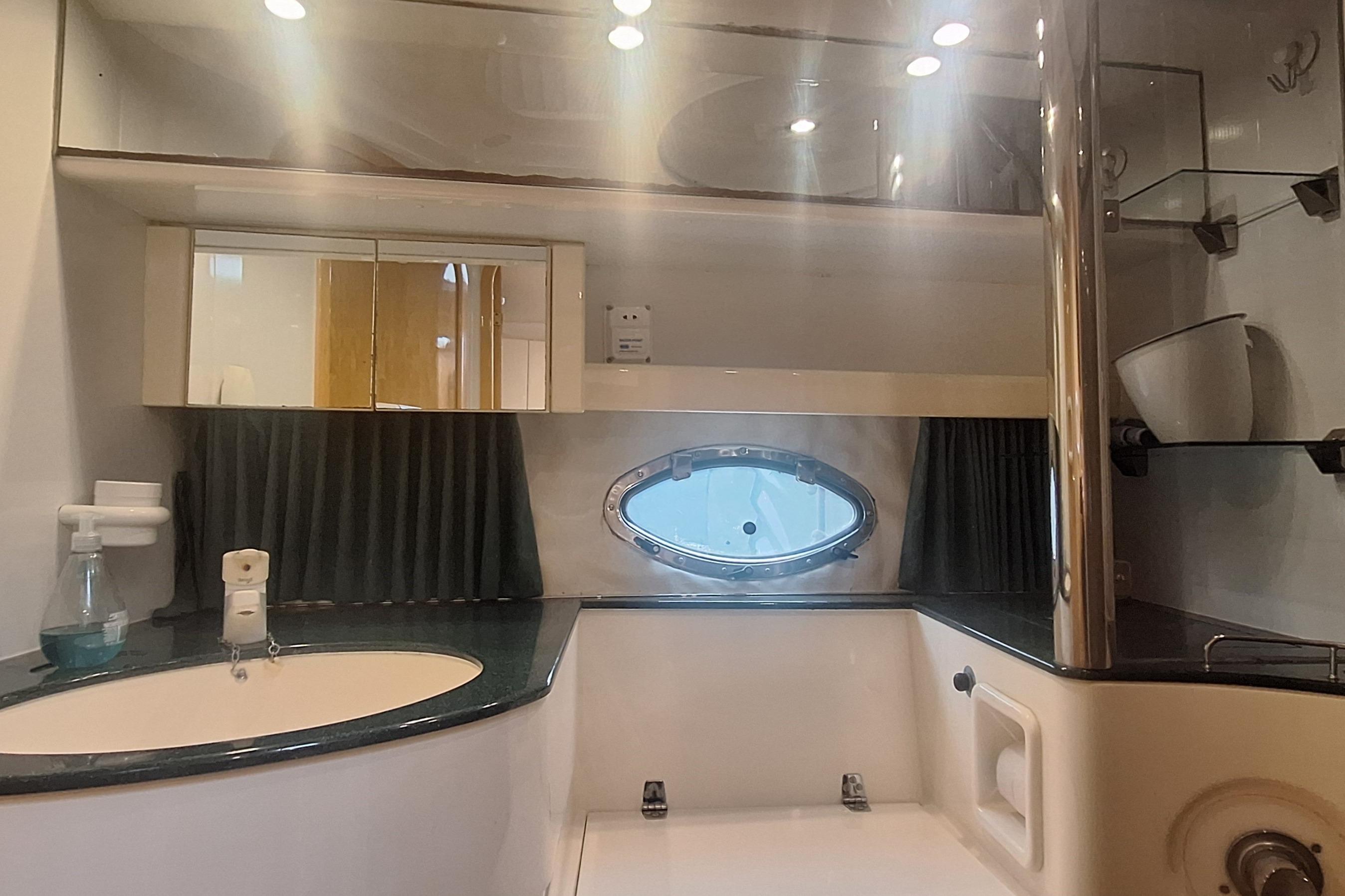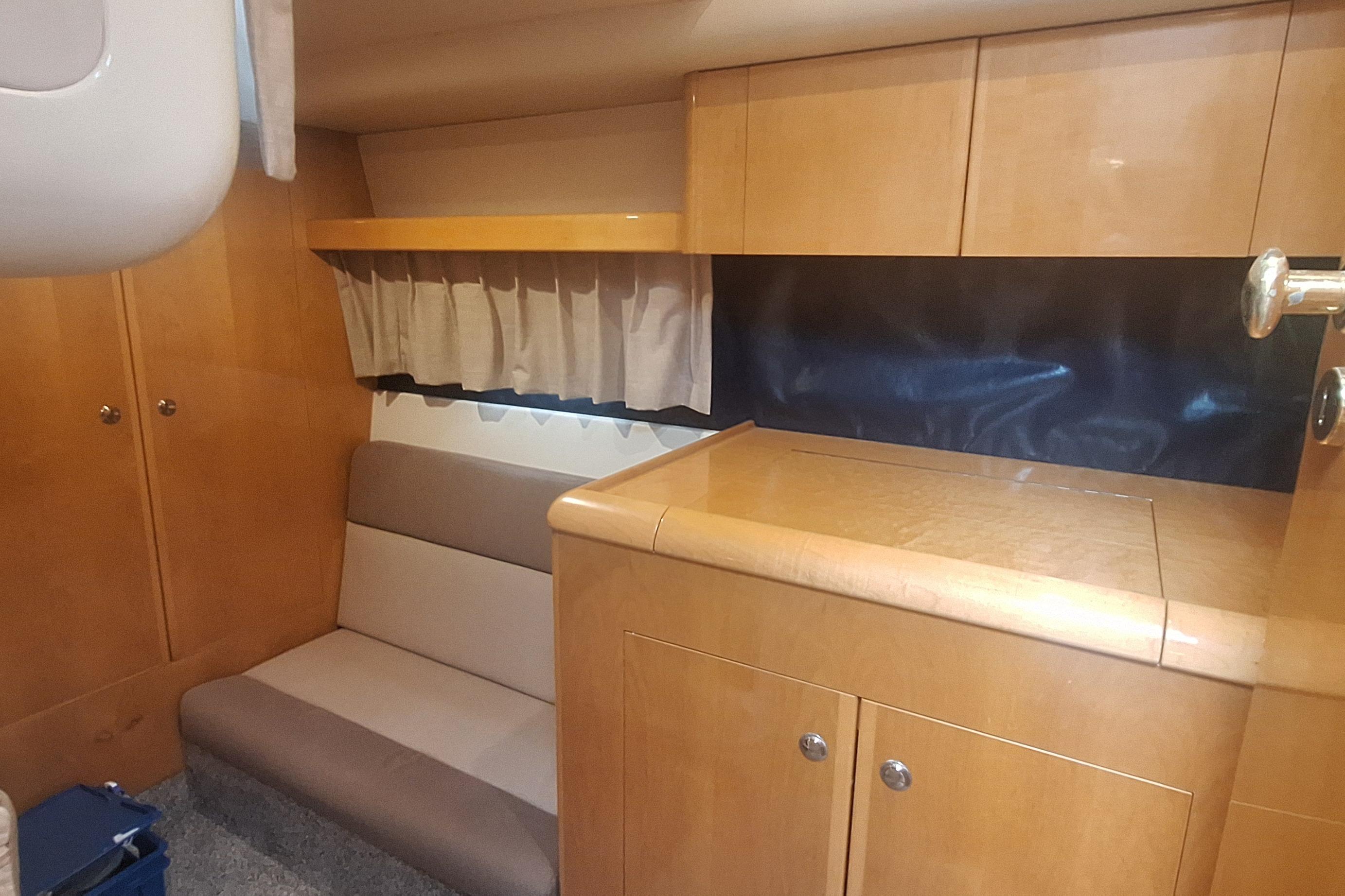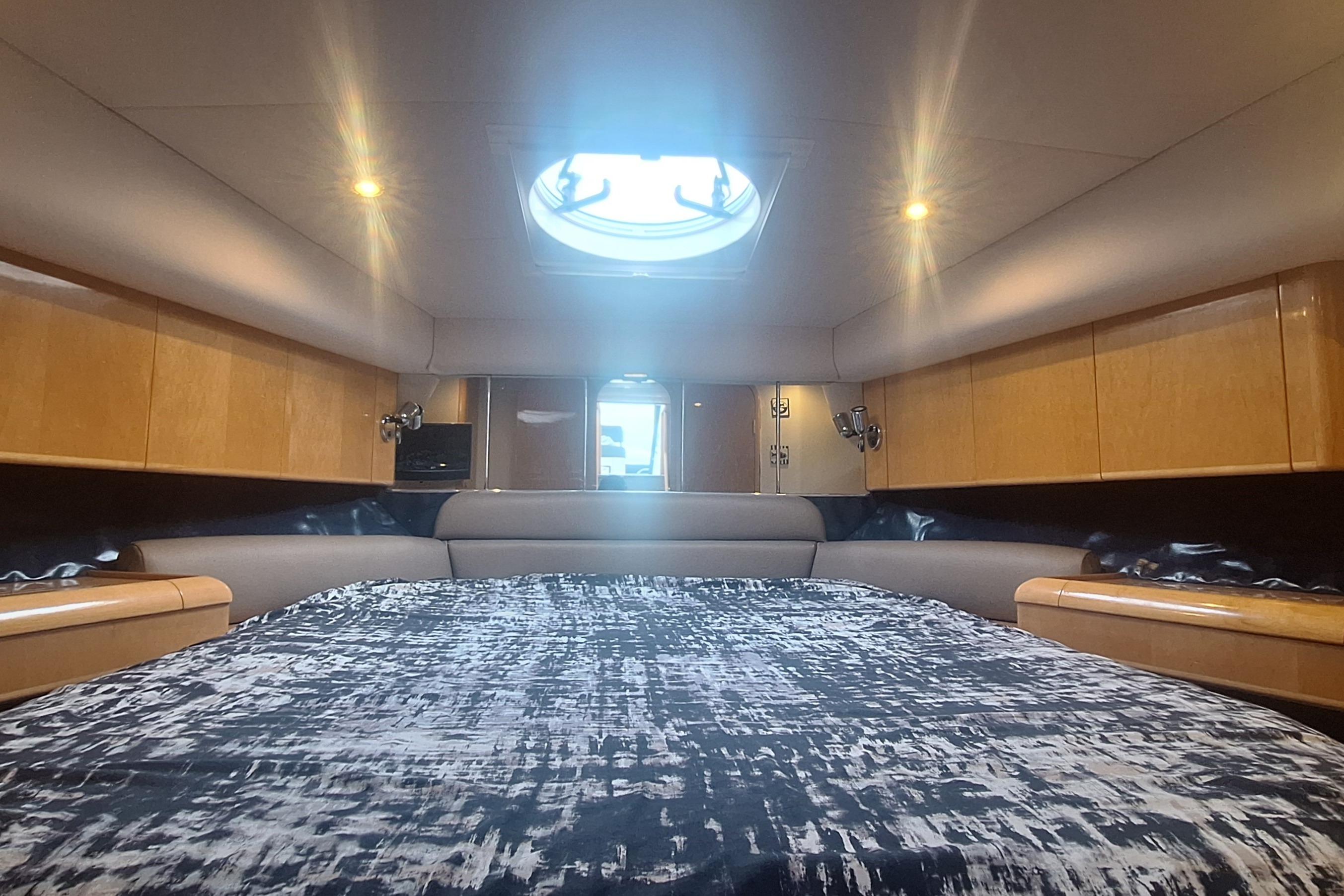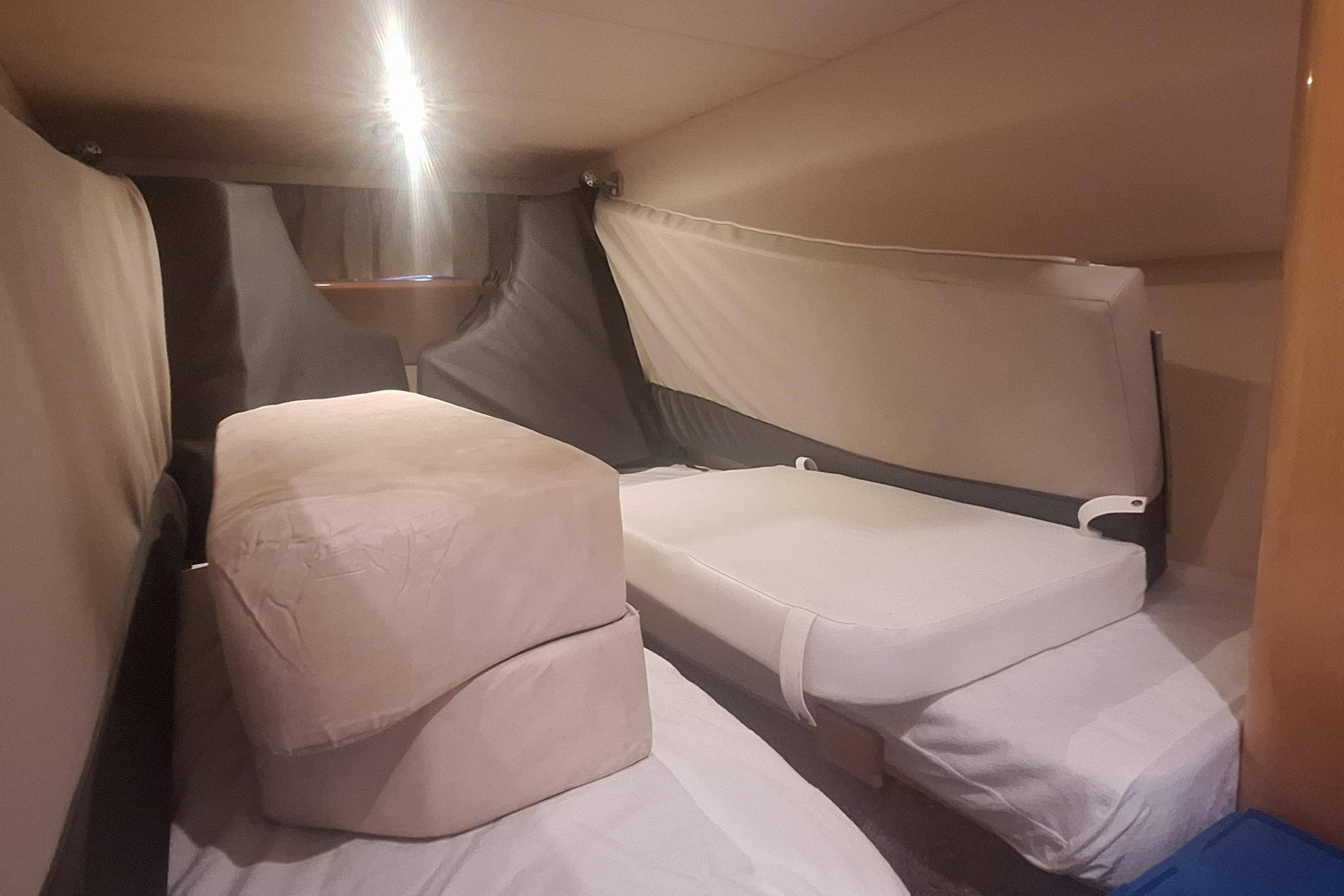 De ownerscabin bevindt zich voorin en is voorzien van een groot comfortabel bed, een hang/leg kast, plenty bergruimte en ensuite de centraal geplaatste badkamer. Daarin bevinden zich een separate douche cabine, een elektrisch toilet en een wasbakje met onder en boven bergruimte. De guestcabin bevindt zich achterin het jacht, ook voorzien van een zitbankje, een wasbakje met warm en koud water, een hang/leg kast en twee enkele bedden.