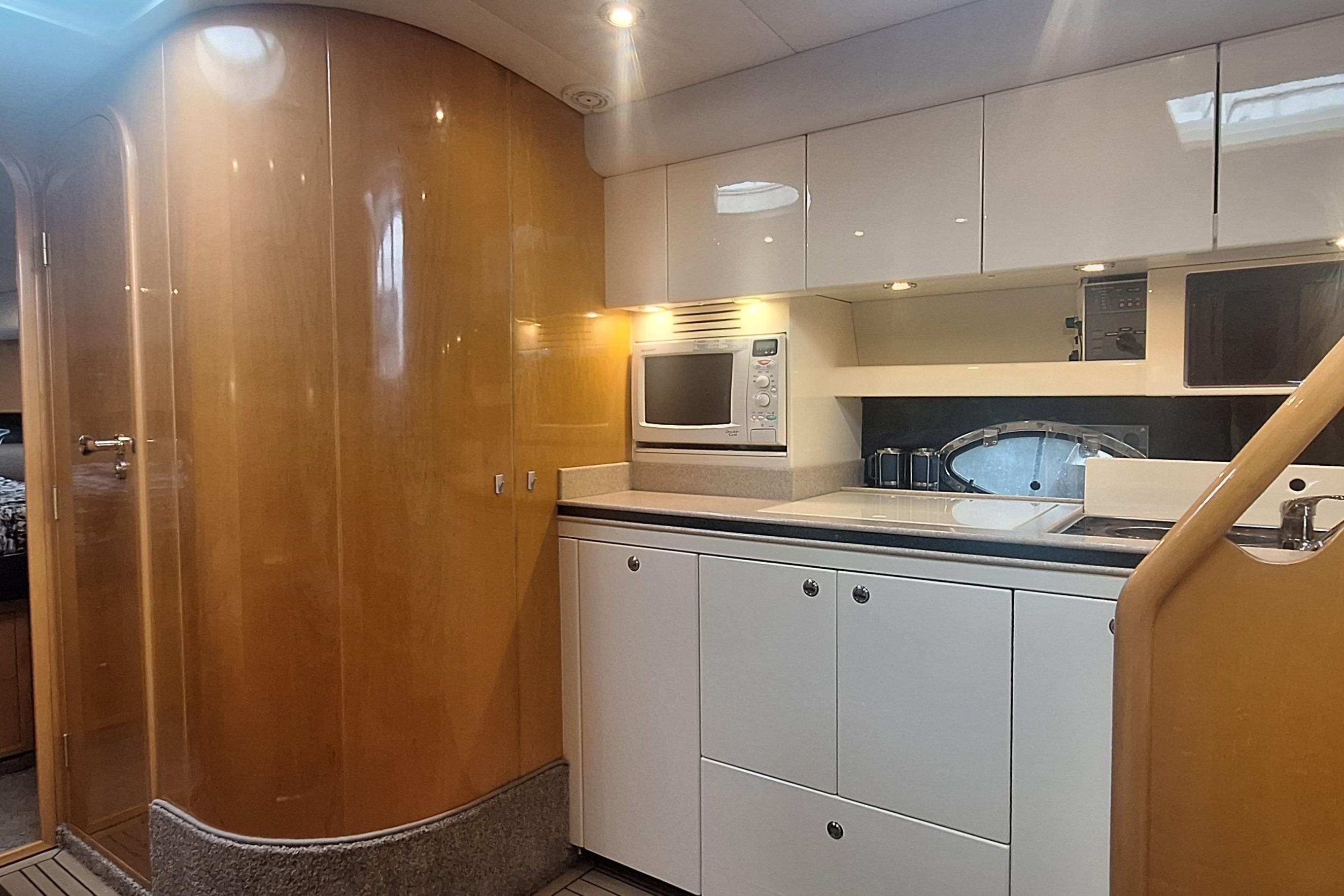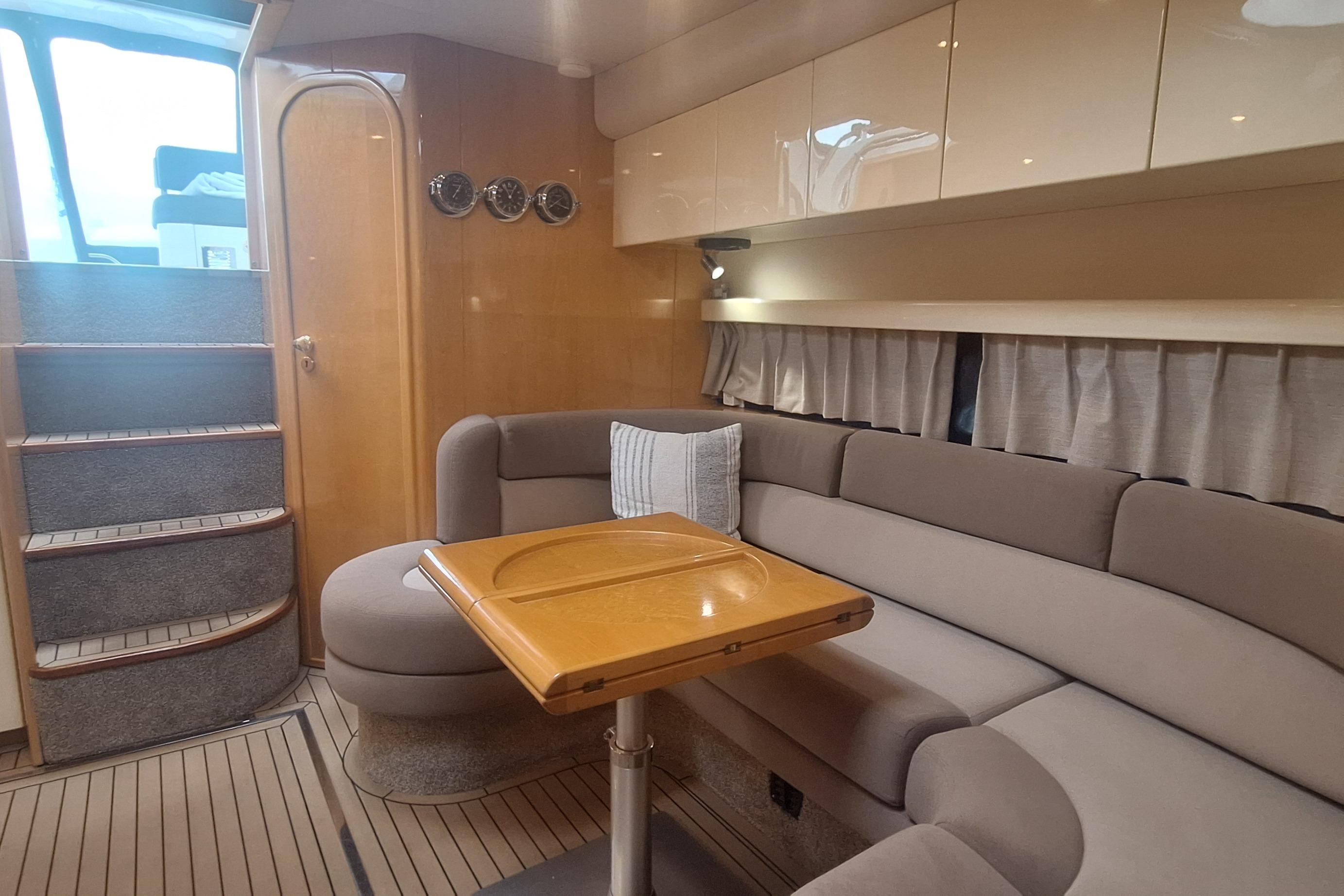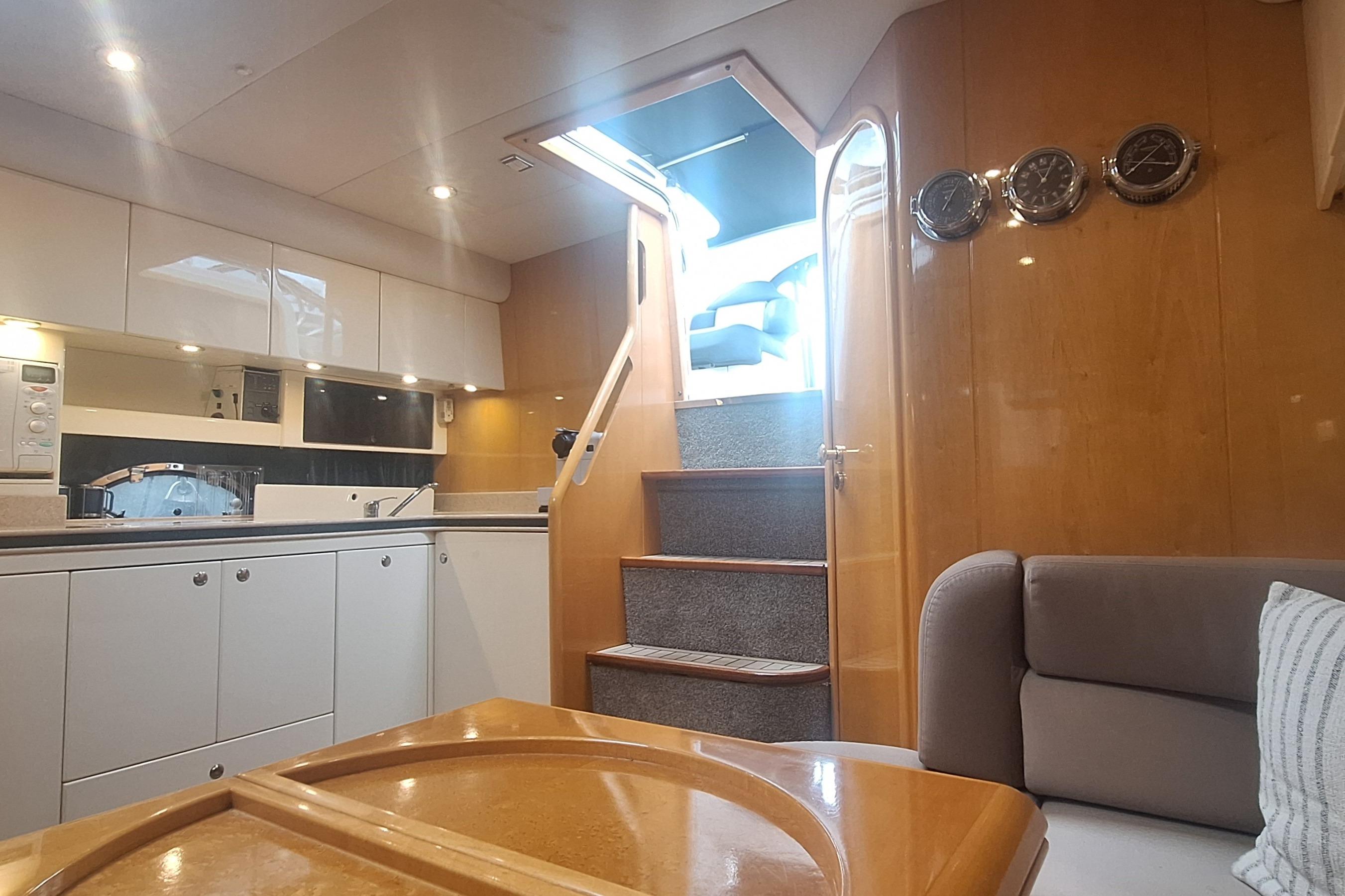 De salon is afgewerkt in licht eiken en voorzien van een ruime U vormige bank Er is een hoog/laag verstelbare salon/eet tafel en aan stuurboordzijde is de galley, voorzien van een tweepits ceramische kookplaat, combimagnetron, grote koelkast en voldoende bergruimte. Ook bevindt zich daar het electropaneel, alles zeer overzichtelijk en eenvoudig te bedienen.