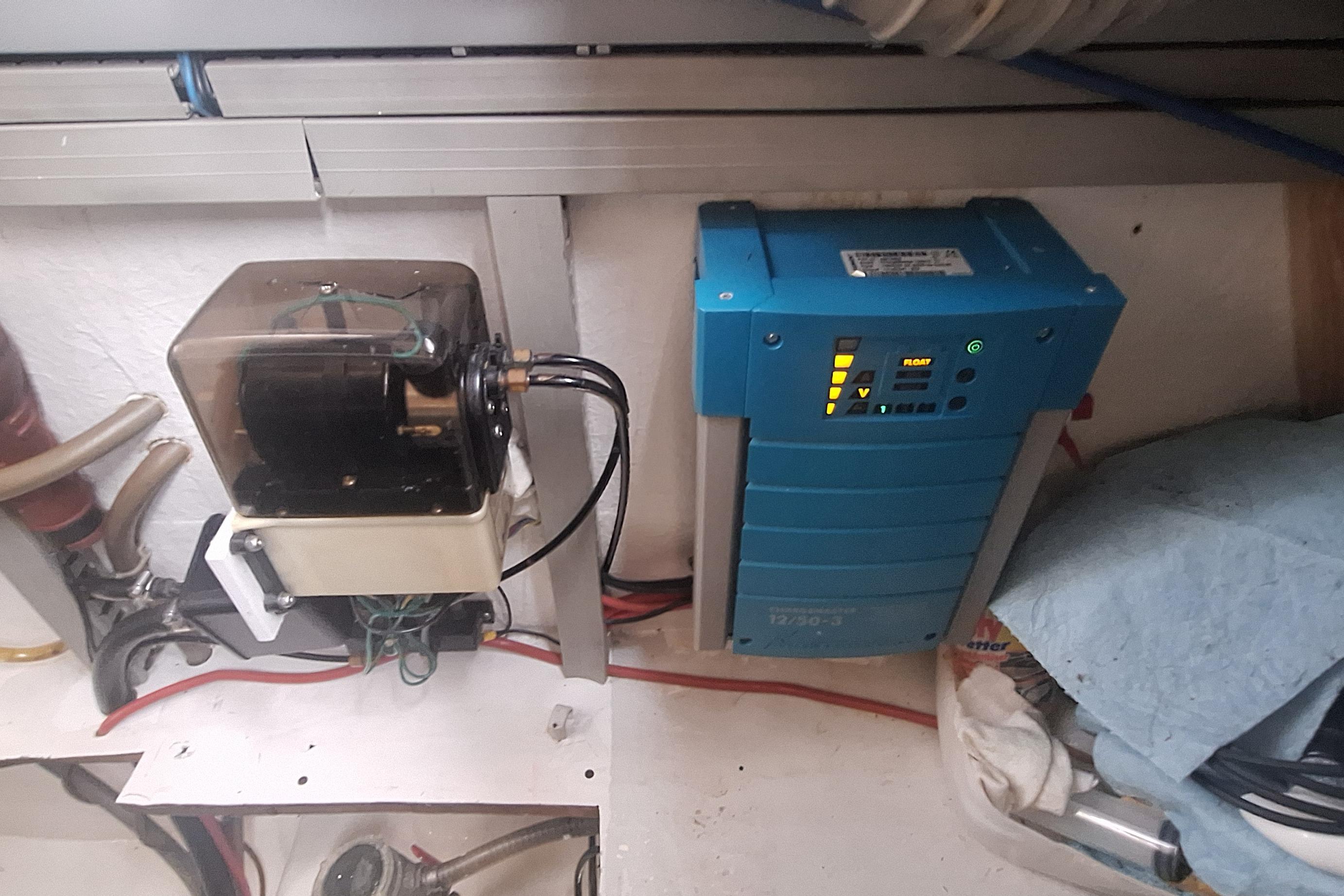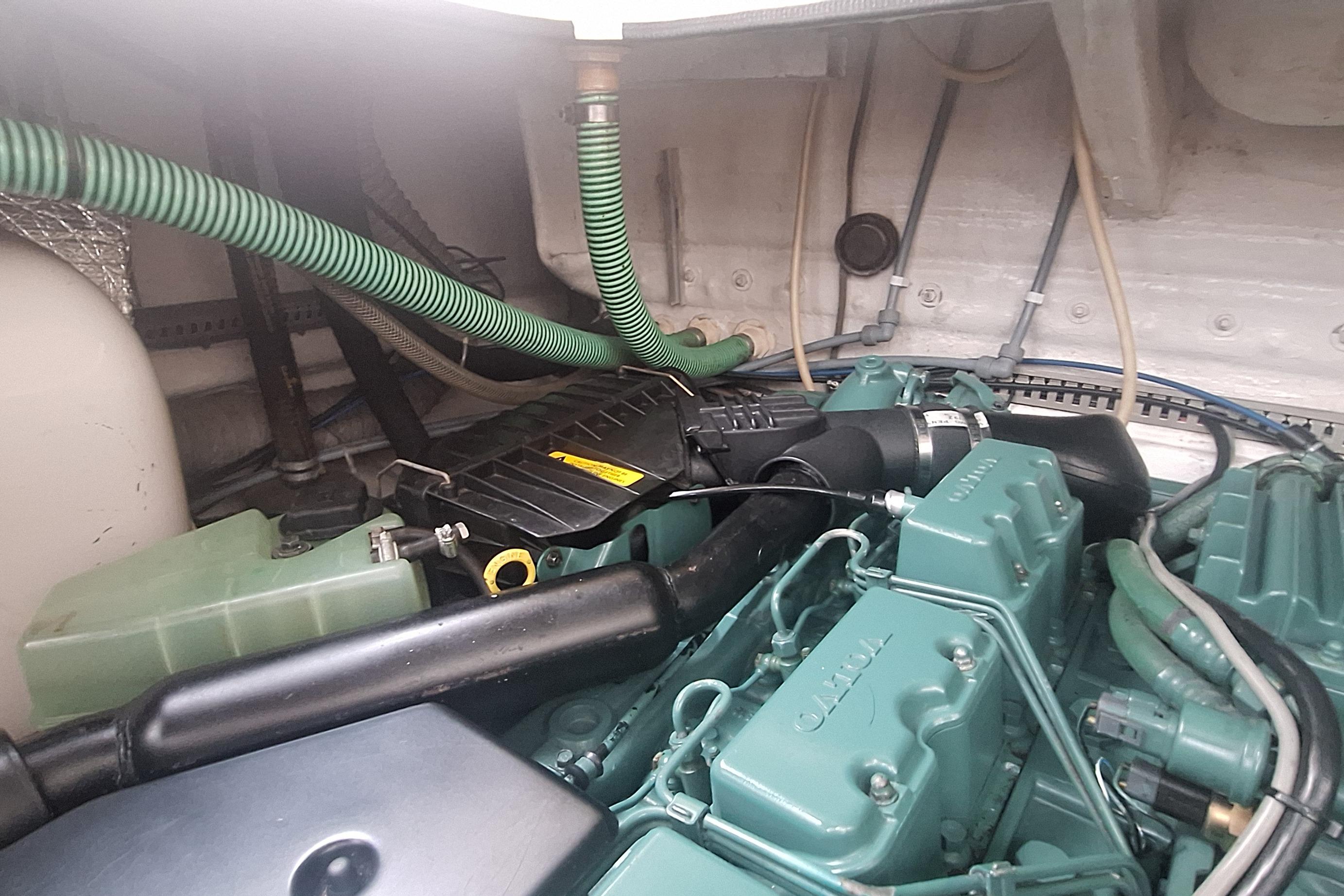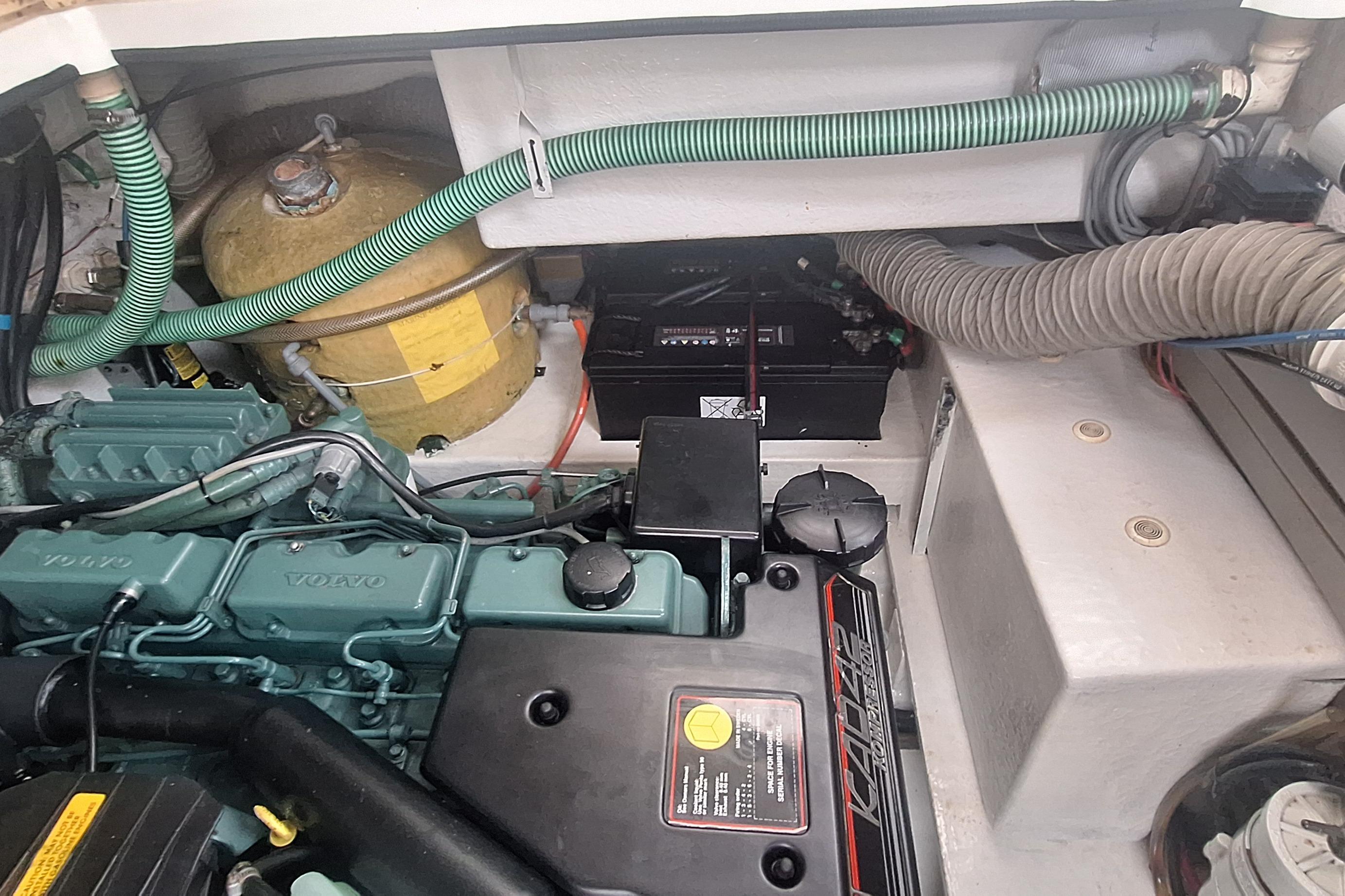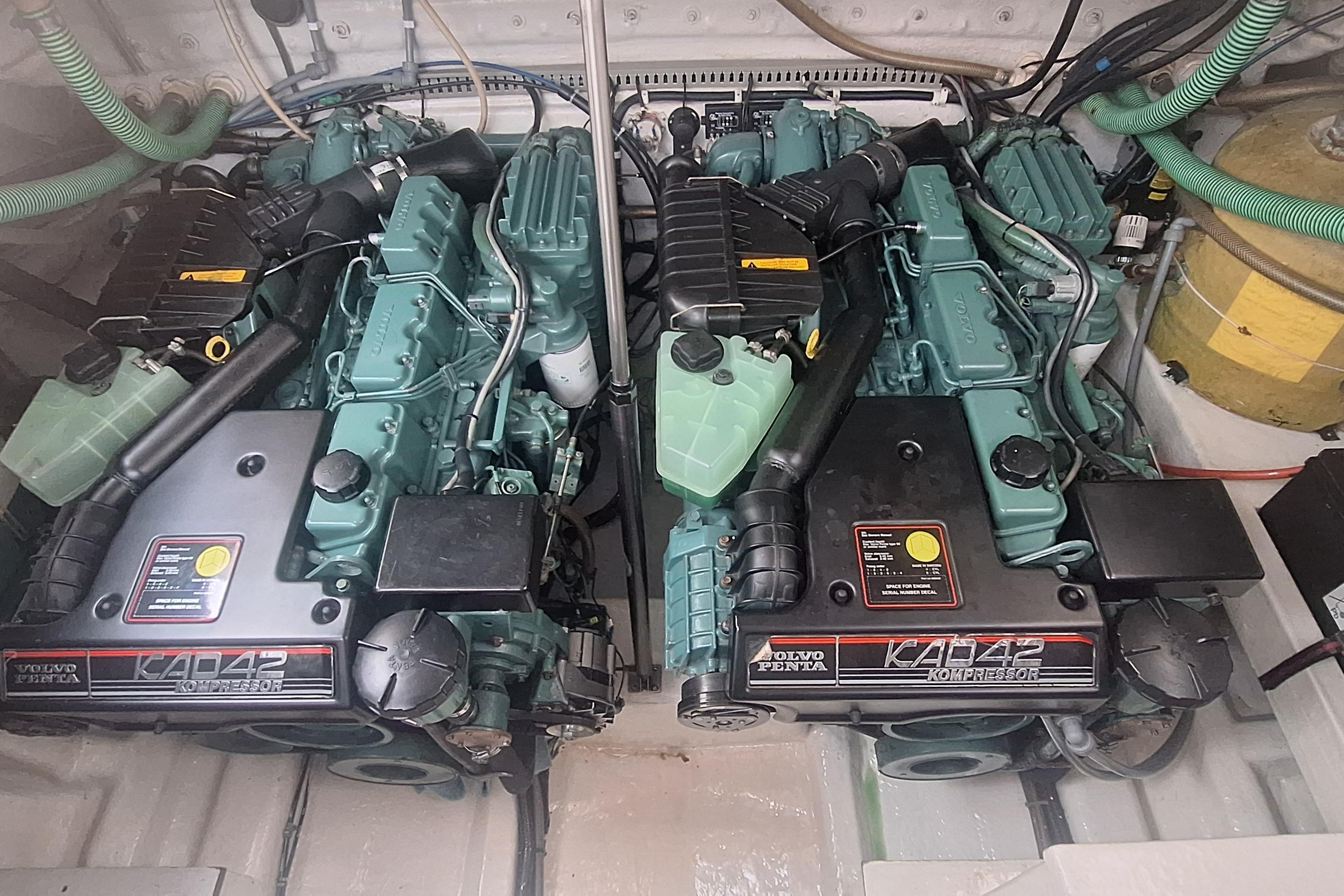 Deze Targa 39 wordt aangedreven door een tweetal perfect onderhouden Volvo Penta KAD42P dieselmotoren met ongeveer 2300 draaiuren. In de eenvoudig toegankelijke machinekamer heb je voldoende ruimte rondom de motoren en is er plenty bergruimte. Het motorluik opent electrisch. De Targa 39 heeft twee gescheiden dieseltanks met keuzekranen net als de grotere modellen en de Separ dieselfilters zijn eenvoudig te bereiken. Tussen de tanks is een ruime bergruimte, ideaal voor gereedschap en reserve delen. Er is een stille Mastervolt generator gemonteerd waardoor 220V aan boord gewaarborgd is.