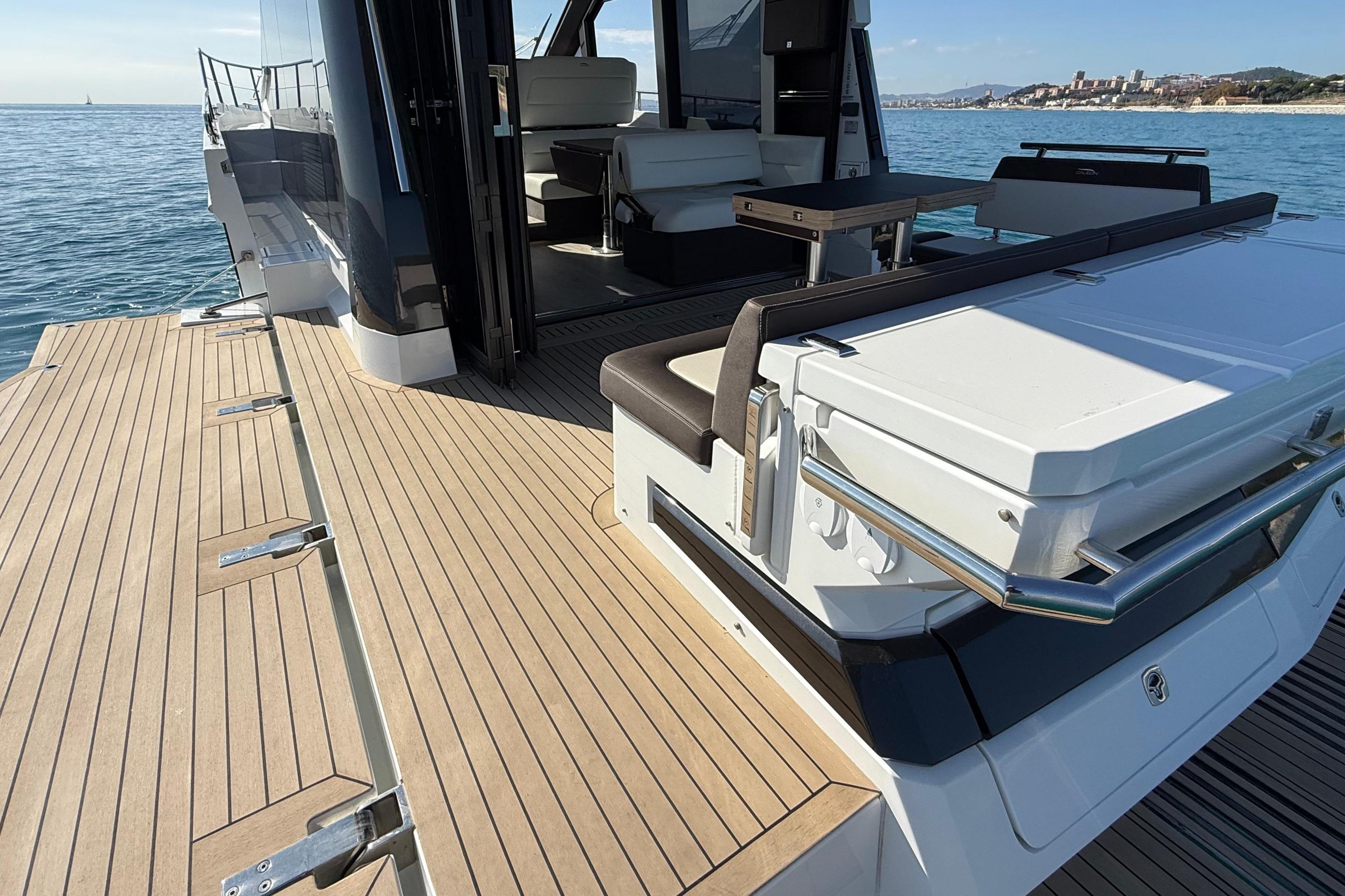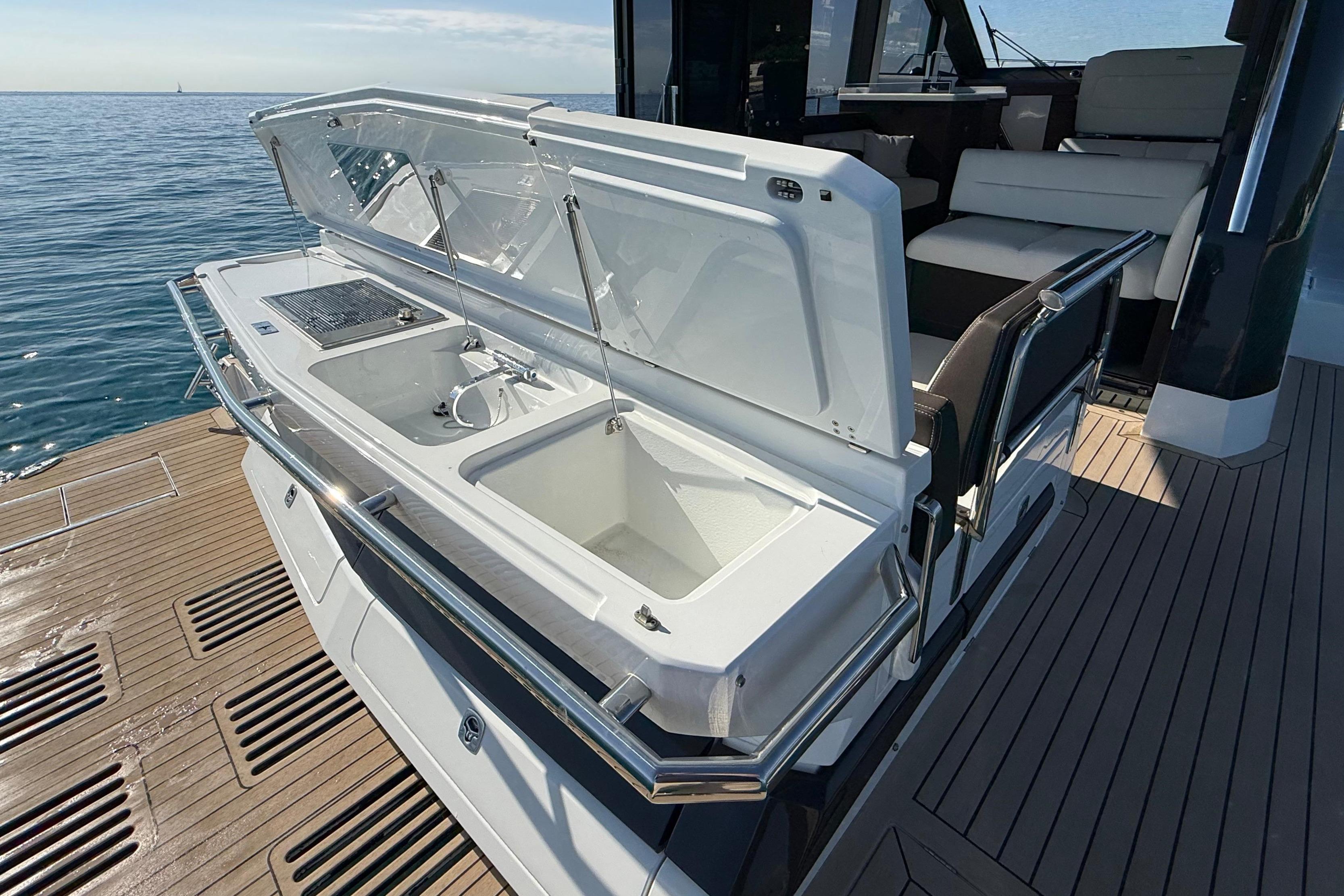 Aan dek valt direct de elegante, dynamische styling op, met natuurlijk een hydraulisch zwemplatform met maar liefst 400kg hefgewicht. Op het achterdek vinden we een echte buitenkeuken met plenty bergruimte, wasbak met warm en koud water, een grill-plaat en koelvak.