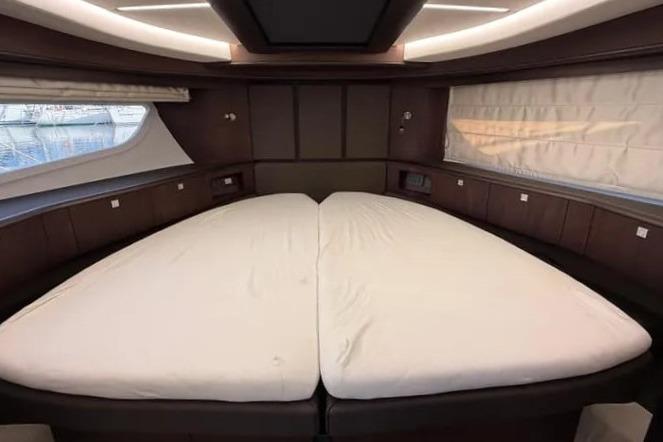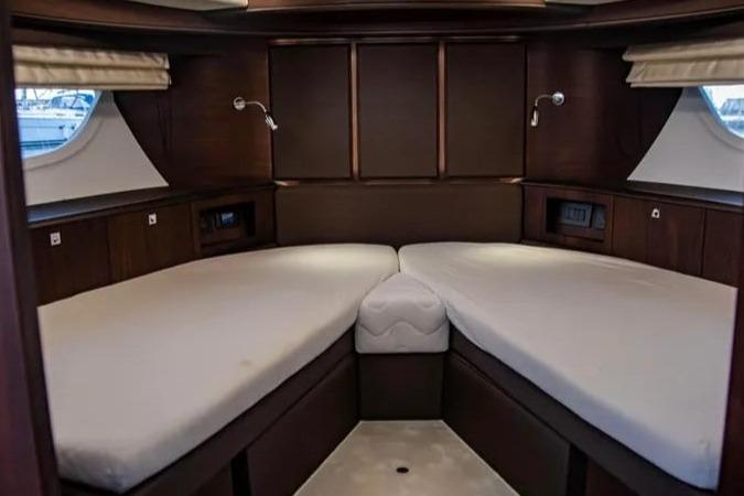 Beneden bevinden zich twee royale hutten, waaronder een full-beam master cabin, beide met veel kastruimte en een luxe afwerking. De twee badkamers met separate douche zijn ruim en modern vormgegeven. De VIP cabin heeft een scharnierend bed waardoor eenvoudig van twee enkele bedden een groot tweepersoons bed te maken is.